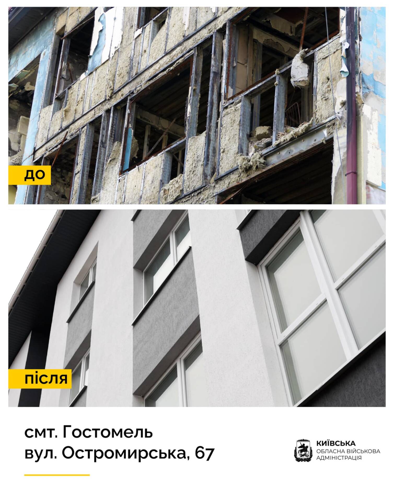 На вулиці Остромирська, 67 у Гостомелі відновили багатоквартирний житловий будинок, зруйнований росіянами, повідомив голова Київської обладмінстрації Руслан Кравченко.