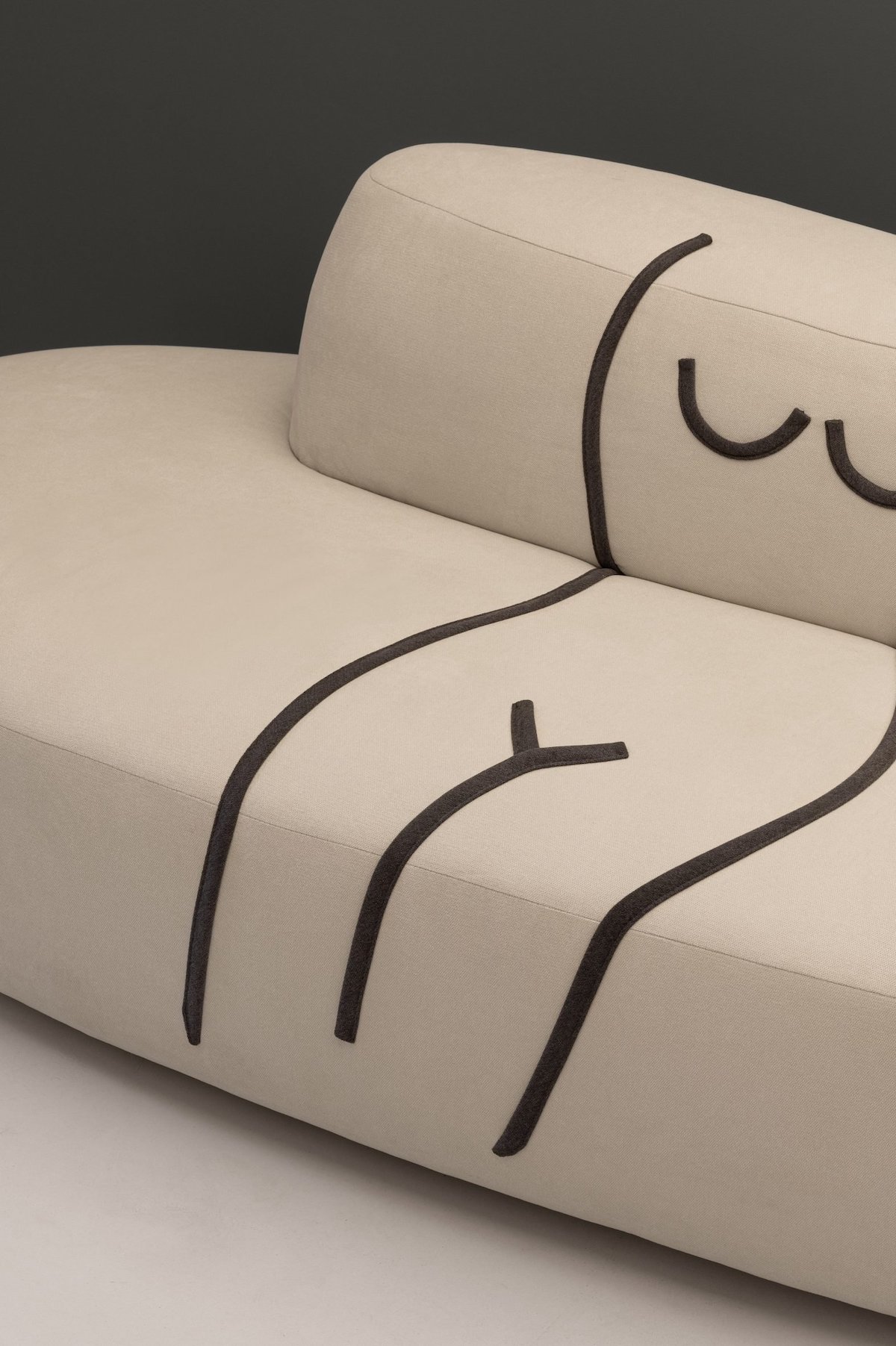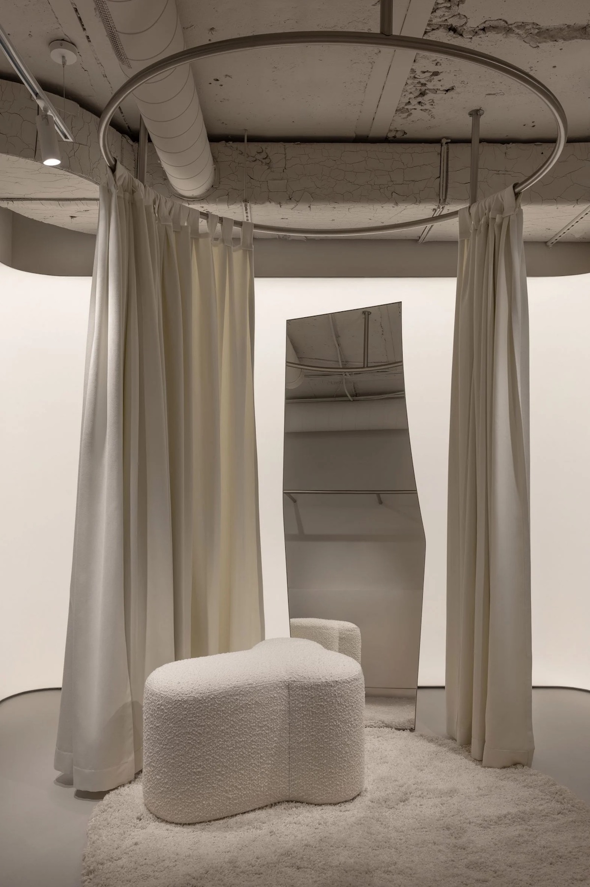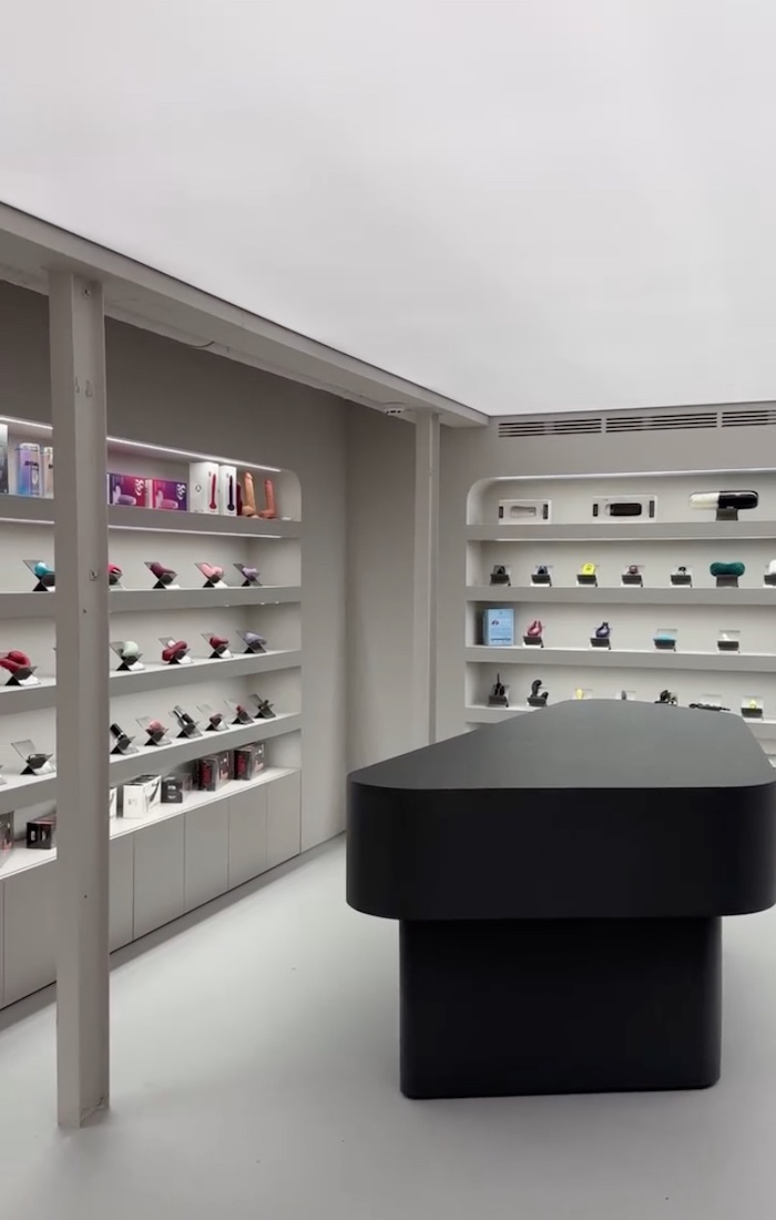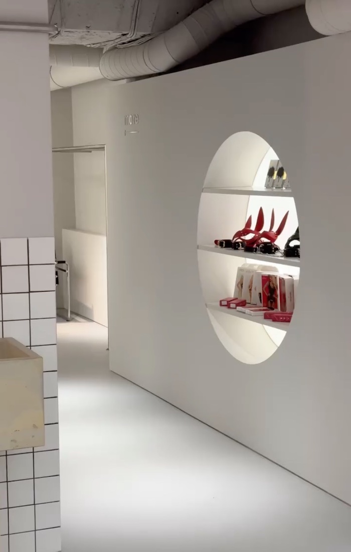 Простір вирізняють нейтральні кремові та світло-сірі тони з металевими акцентами та м’яке світло. Дизайнерки прагнули відійти від естетичних кліше, типових для магазинів інтимних товарів, таких як неонова підсвітка та зображення получничок.