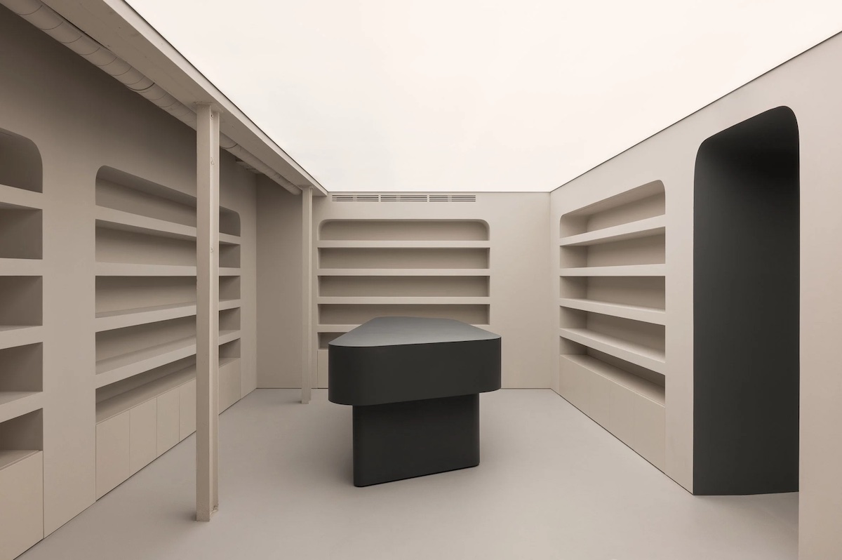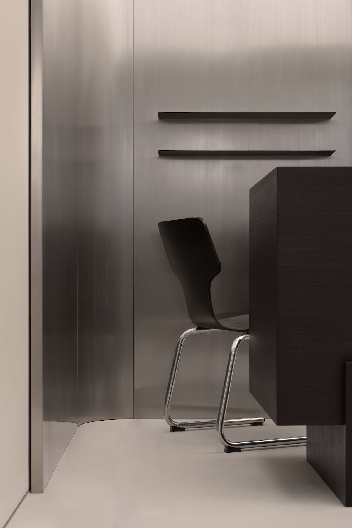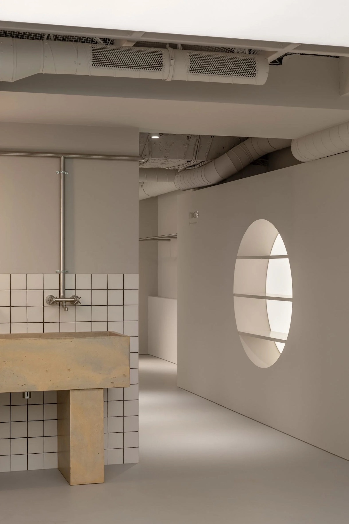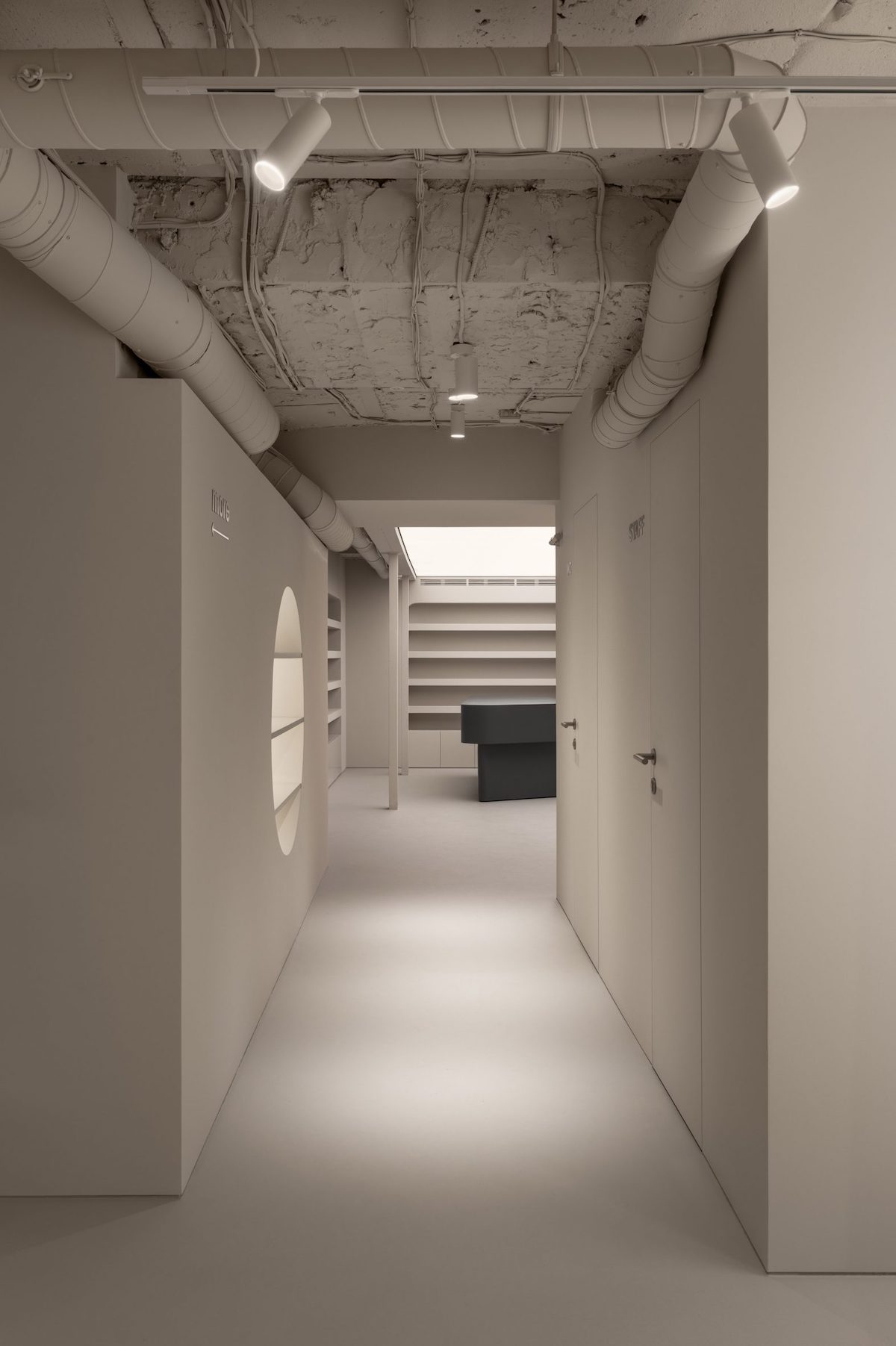 Магазин розташовано у підвалі, де немає денного світла. Його компенсують світлові панелі на стелі та стінах. Матовані металеві поверхні та дзеркала також відбивають світло.