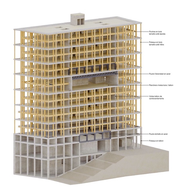 Основним матеріалом є бук, найпоширеніша деревина Франції. Зовнішні колони виготовлено з вологостійкої дуґласії тисолистої, підлогу — з дерев’яно-бетонного композиту. Балки та колони в інтер’єрах виготовили з пахучої сосни, оскільки вона має необхідну міцність на вигин. Архітектори прагнули домогтися відчуття, що мешканці живуть у дереві.