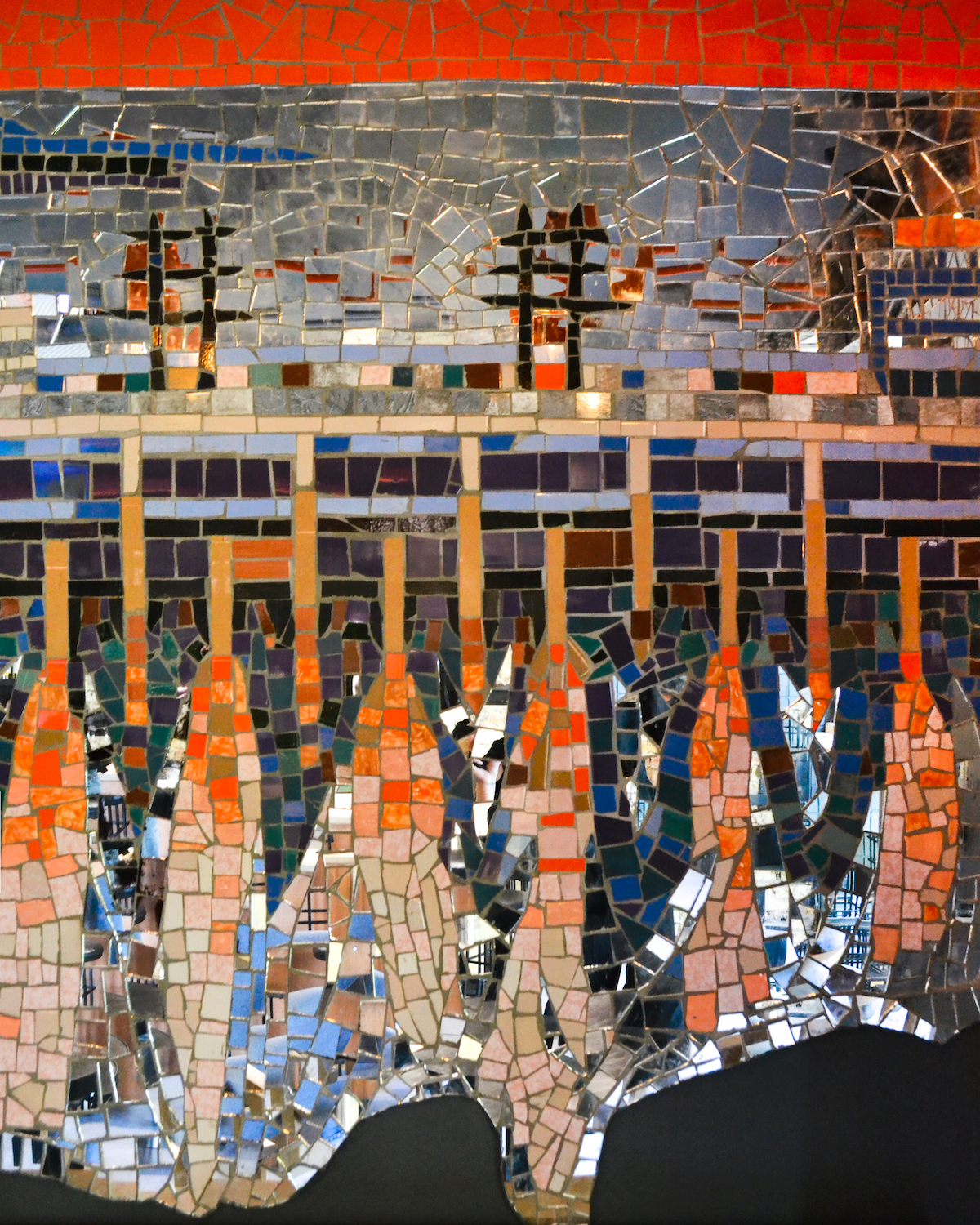 Мозаїка зображає місто Вишгород із дамбами та гідроелектростанцією.