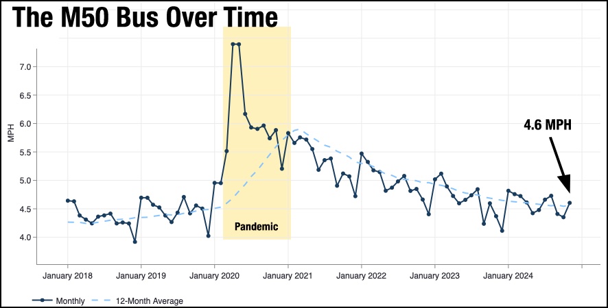 Автобусний маршрут M50 був одним із найповільнішим на Мангеттені принаймні з 2015 року, а з вересня 2023-го впевнено тримав пальму першості, повідомляє Streetsblog New York City.