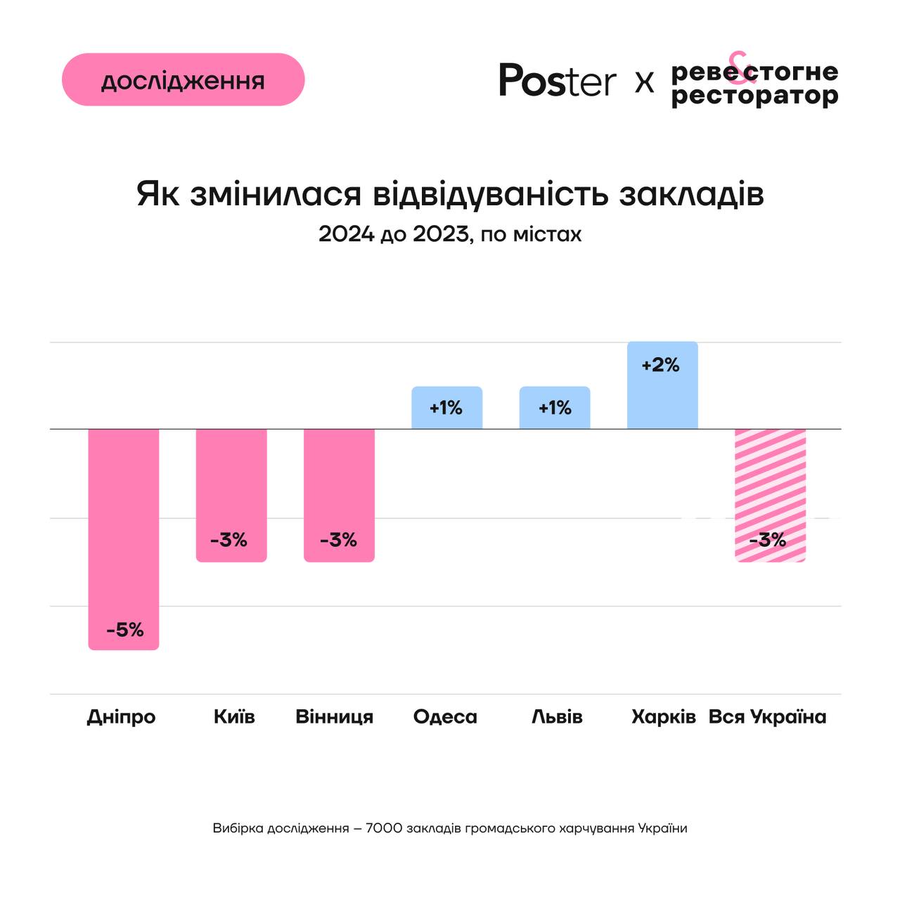 При цьому відвідуваність впала на 3%. Серед причин — економічна невизначеність та посилення мобілізації. При цьому перше півріччя було успішнішим, ніж друге. Найгіршу річну динаміку показало Дніпро, де відвідуваність упала на 5%. Зросла кількість гостей у закладах Харкова, Львова та Одеси.