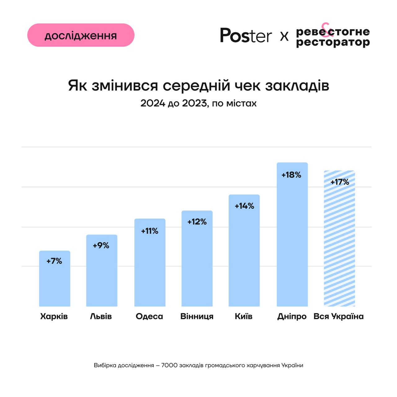 Середній чек ресторанів зріс із 518 гривень до 610 гривень. Середній чек кафе збільшився з 239 гривень до 276 гривень.