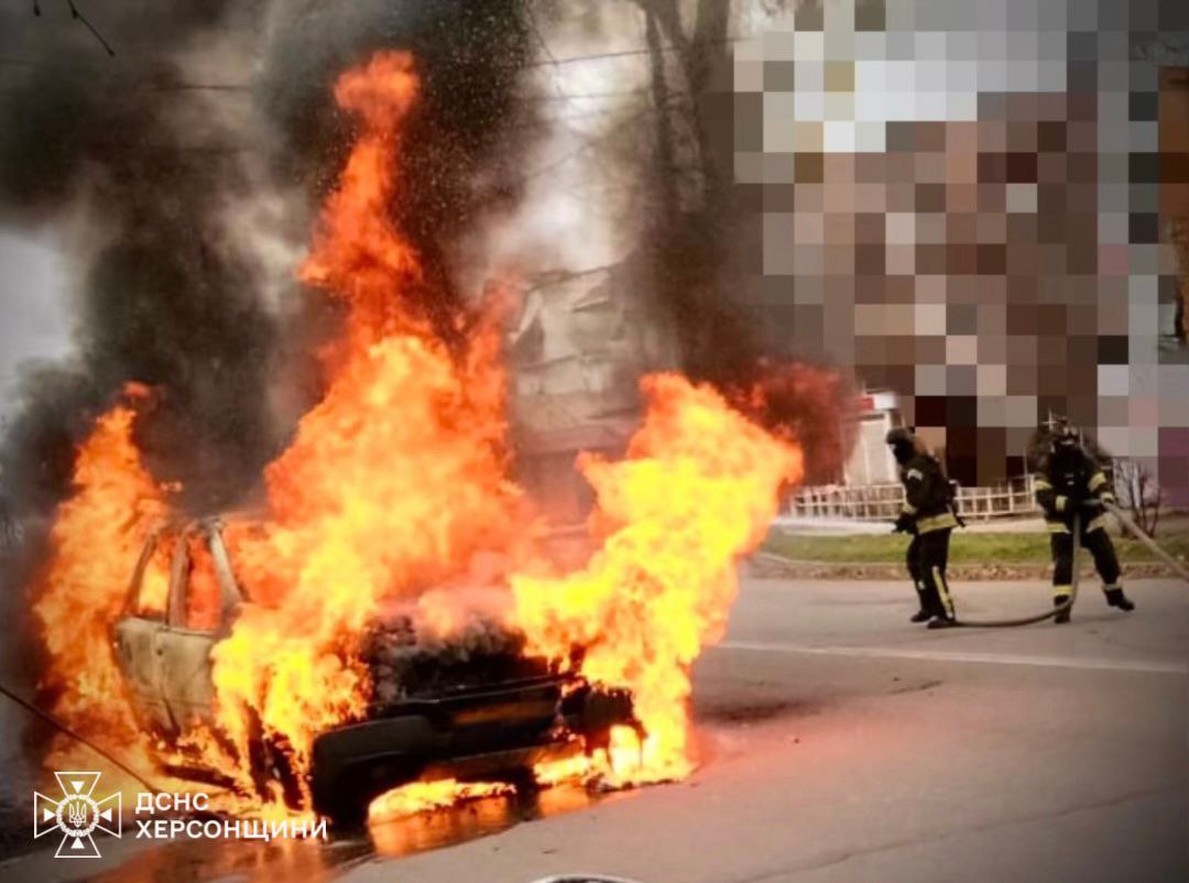 Зранку російські безпілотники атакували Херсон. Один із дронів влучив у автомобіль, що рухався вулицею, автівку миттю охопило полум’я, повідомляє ДСНС.