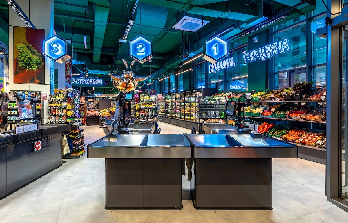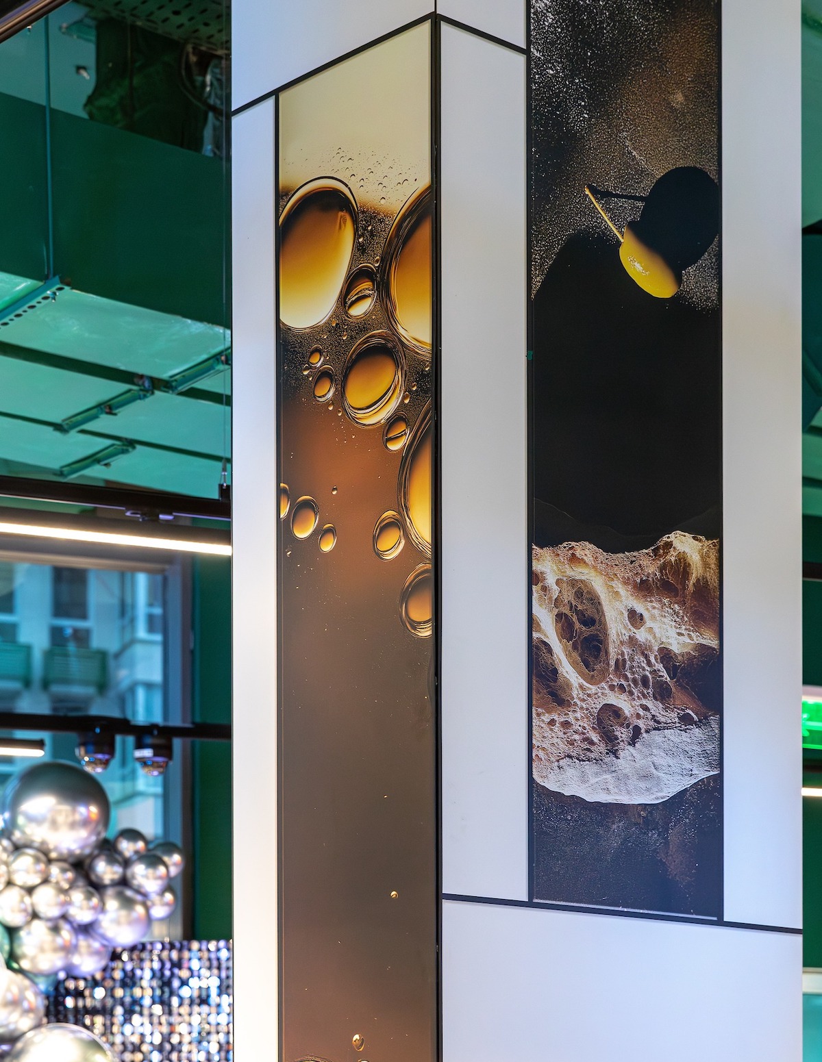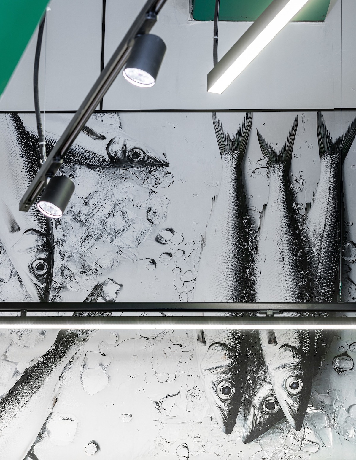 На вході відвідувачів зустрічає великий дзеркальний кролик, підвішений до стелі. Відділ гастрономії прикрасили різнокольоровими дзеркалами.