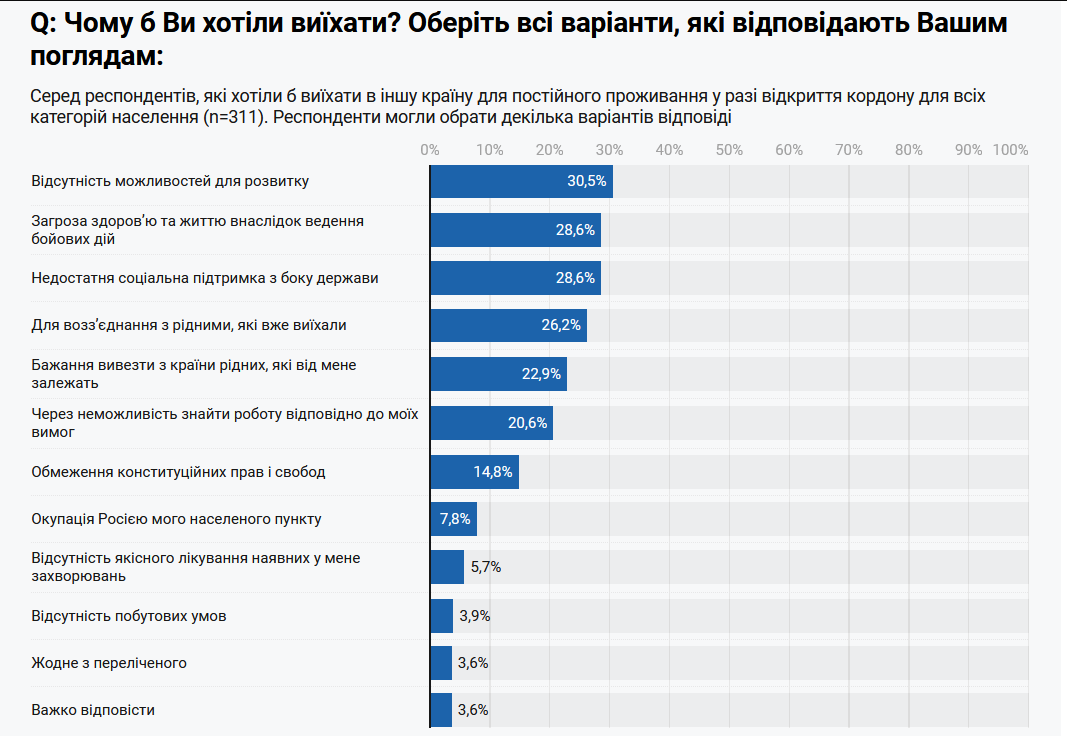 30% тих, хто бажає виїхати, назвали головною причиною відсутність можливостей для розвитку. По 29% респондентів вказали загрозу життю через бойові дії та недостатню соціальну підтримку від держави. Ще 23% зазначили, що хочуть вивезти рідних.