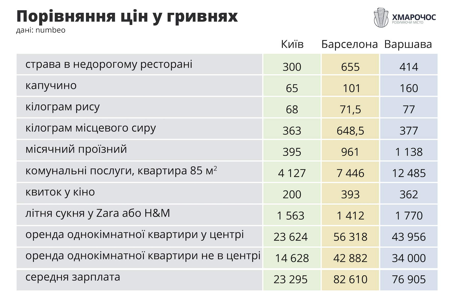 Для порівняння, в Барселоні життя коштує 821 євро плюс оренда від 981 євро, а зарплата складає 1 890 євро. На відміну від Києва, середня зарплата може покрити середні витрати.