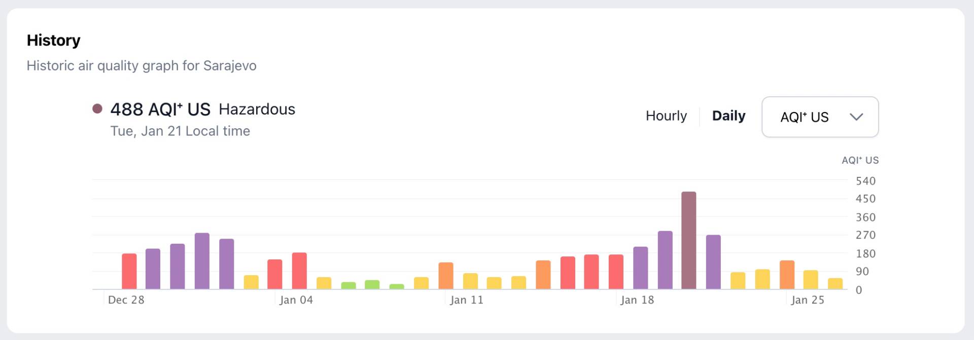 Минулого тижня столиця Боснії і Герцеговини посіла перше місце за забрудненням повітря, рівень якого сягнув майже 500 у рейтингу Air Quality Index.