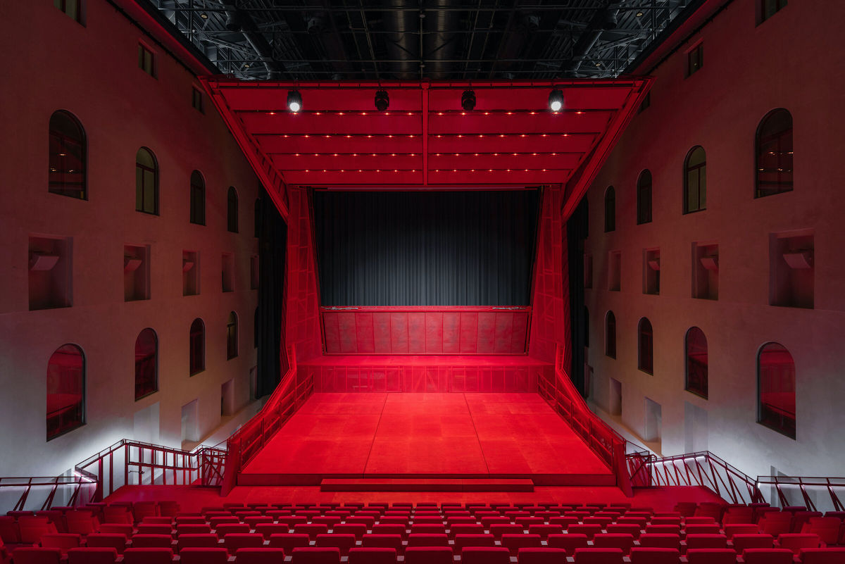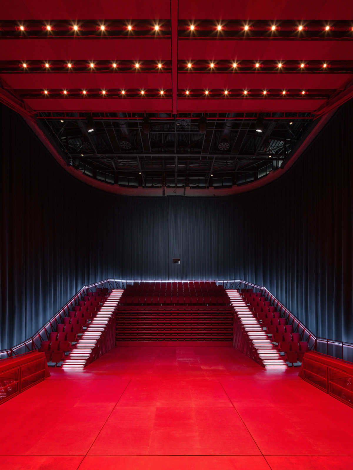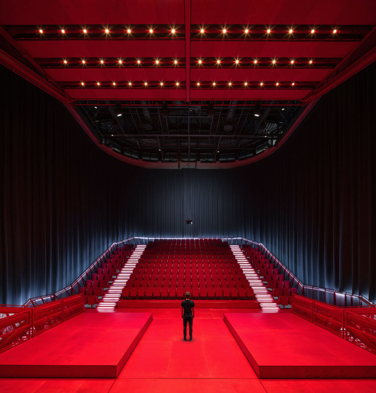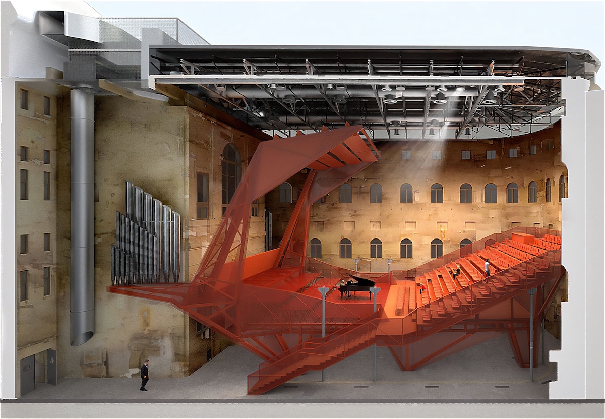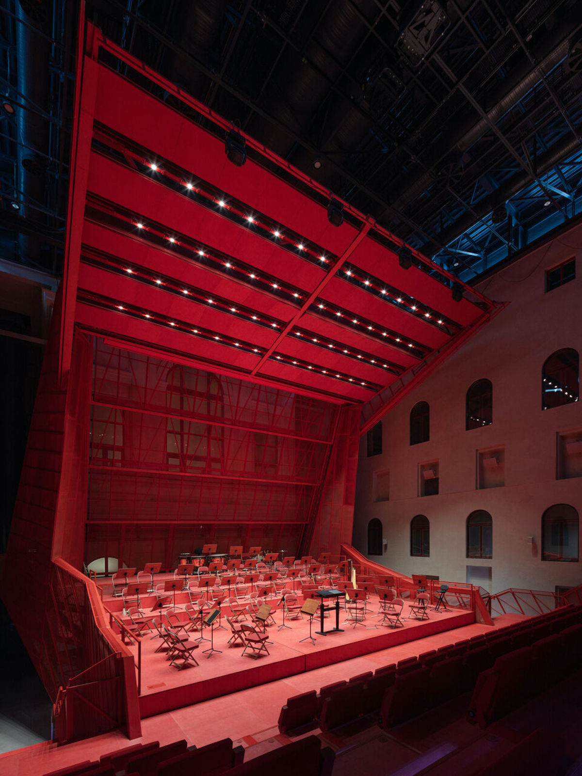 Концертну залу створили в атріумі, який раніше слугував машинною залою з конвеєром торфу. Власне, торф’яна машина, що не збереглася, і лягла в основу концепції редизайну. Хоча оригінальні механізми не передбачалося лишати — хіба тільки чавунні колони, — архітектори розробили іншу «машину», сценографічну та акустичну. Петро Гаєк, засновник студії, порівнює систему з розкладним армійським ножем — транформером, який дозволяє змінювати простір і його параменти до кожної події.