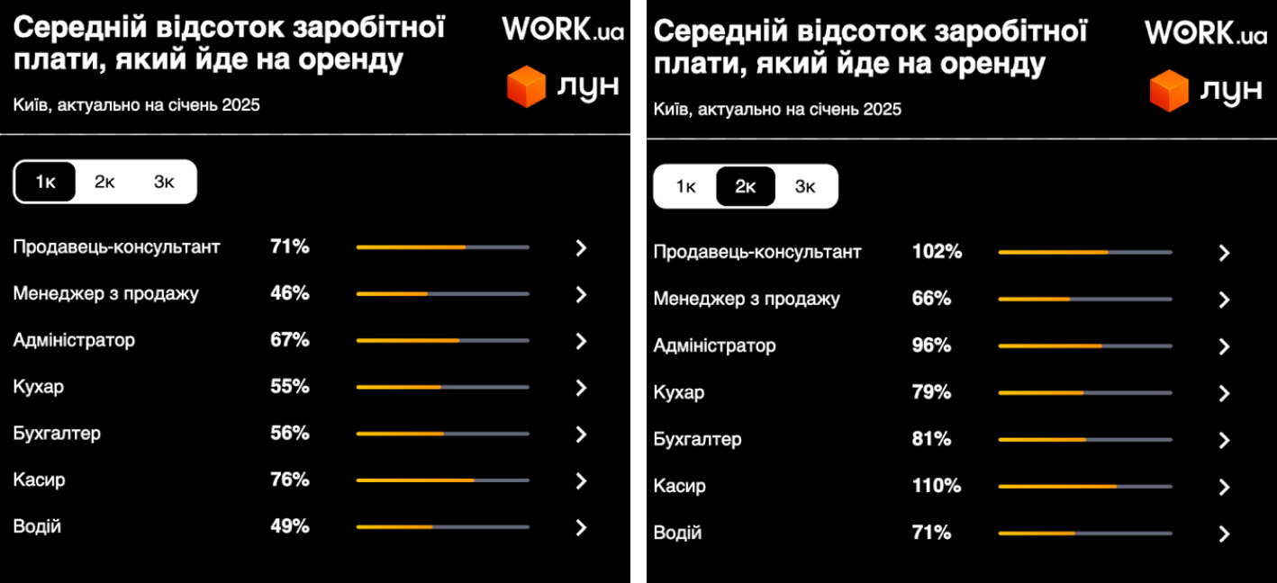 ЛУН та Work.ua порівняли вартість оренди квартир у Києві з середніми зарплатами найпопулярніших професій сайту пошуку роботи. Зокрема виходить, що продавець-консультант має віддати 71% своєї зарплати за оренду однокімнатної квартири, а за двокімнатну — 105%.