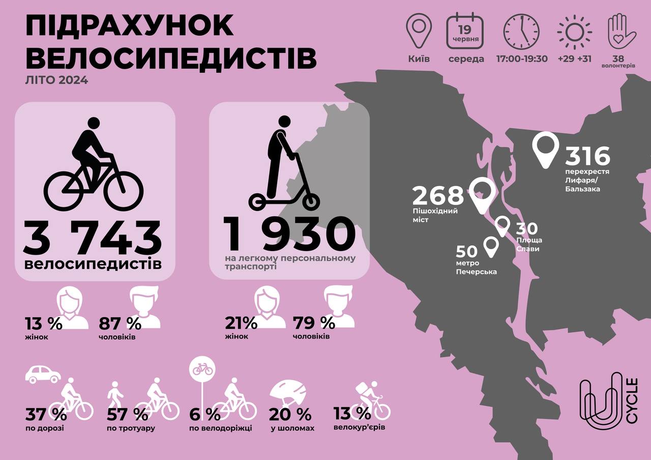 Кількість велосипедистів протягом двох вечірніх годин у будній день становила 3 743 особи, а у вихідний — 3 477. Частка жінок від загальної кількості велосипедистів становила 13-15%. Водночас жінок серед користувачів ЛПТ більше — 18-21%.