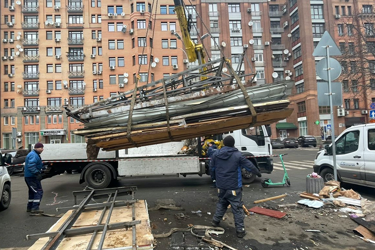 Через значну кількість МАФів та їхні габарити демонтаж здійснюється у кілька етапів. Працюють декілька бригад і підйомні крани.