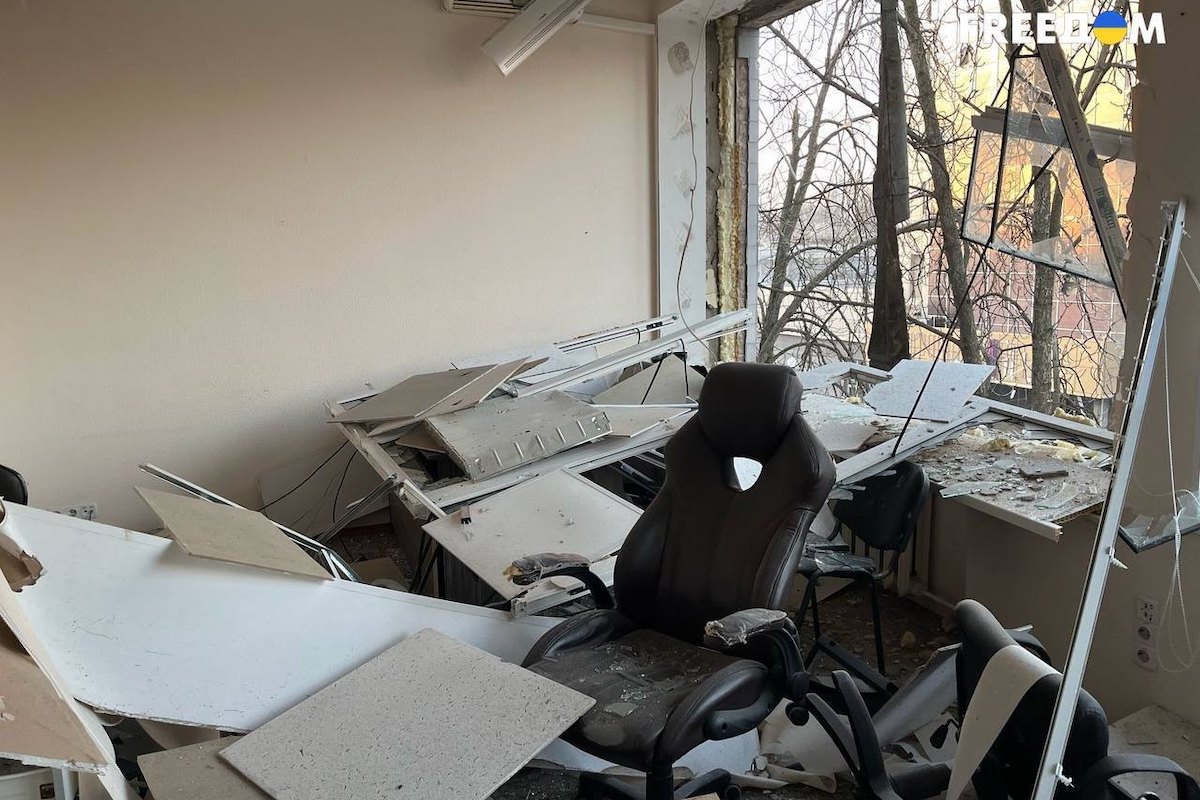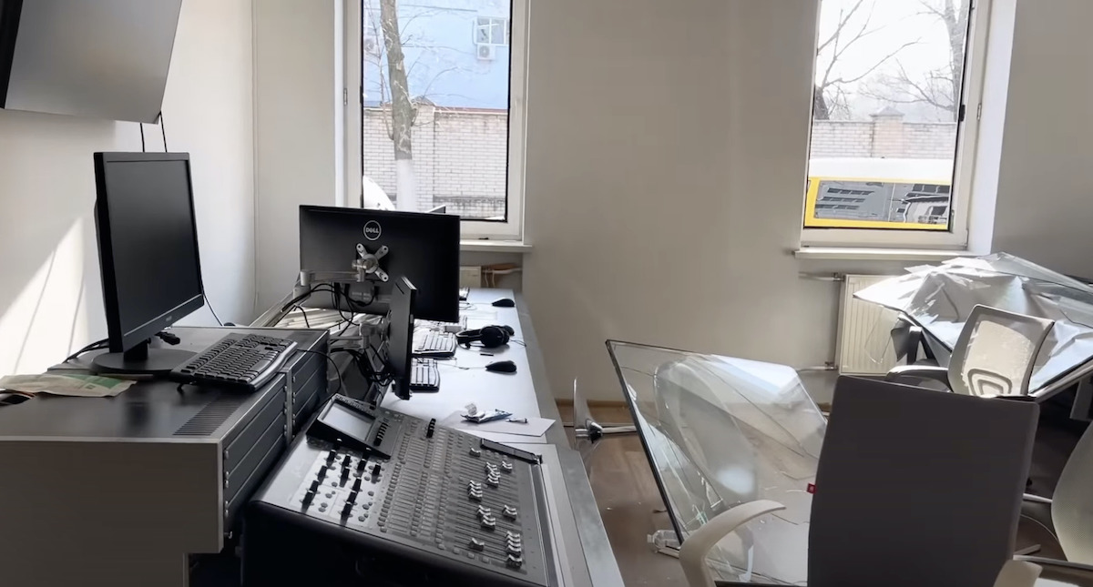 Внаслідок російського ракетного обстрілу Київщини 12 лютого пошкоджено офіс кримськотатарського телеканалу ATR. У кабінетах вибито двері та шибки, на підлозі лежить побите скло. Поламано техніку та меблі.