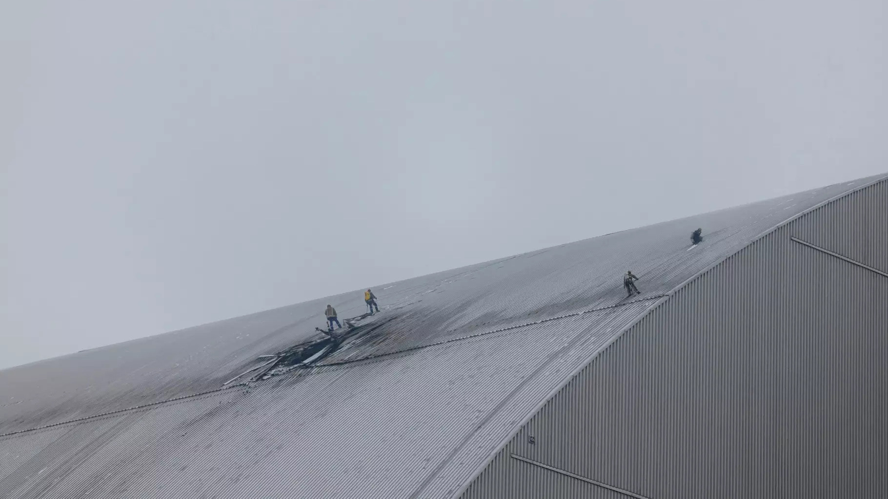 На четвертий день після атаки досі тліє утеплювач покрівлі між шарами металевого покриття. Верхолази роблять отвори у металі, щоб загасити тління мембрани.