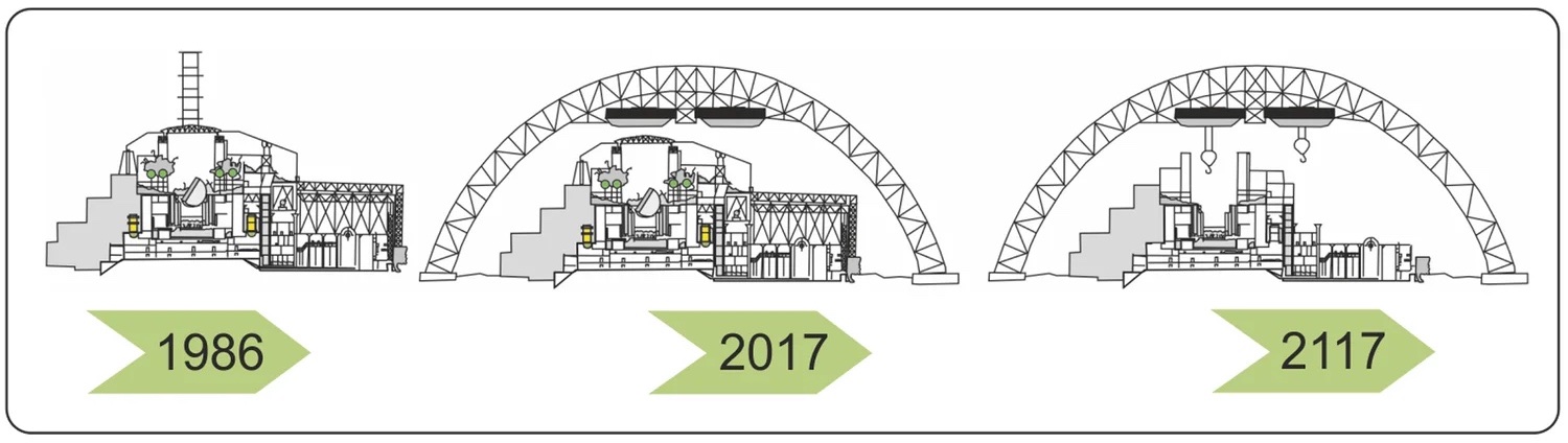 Перше ізоляційне укриття над реактором збудували 1986 року. У 2019 році над старим звели новий саркофаг — Арку.