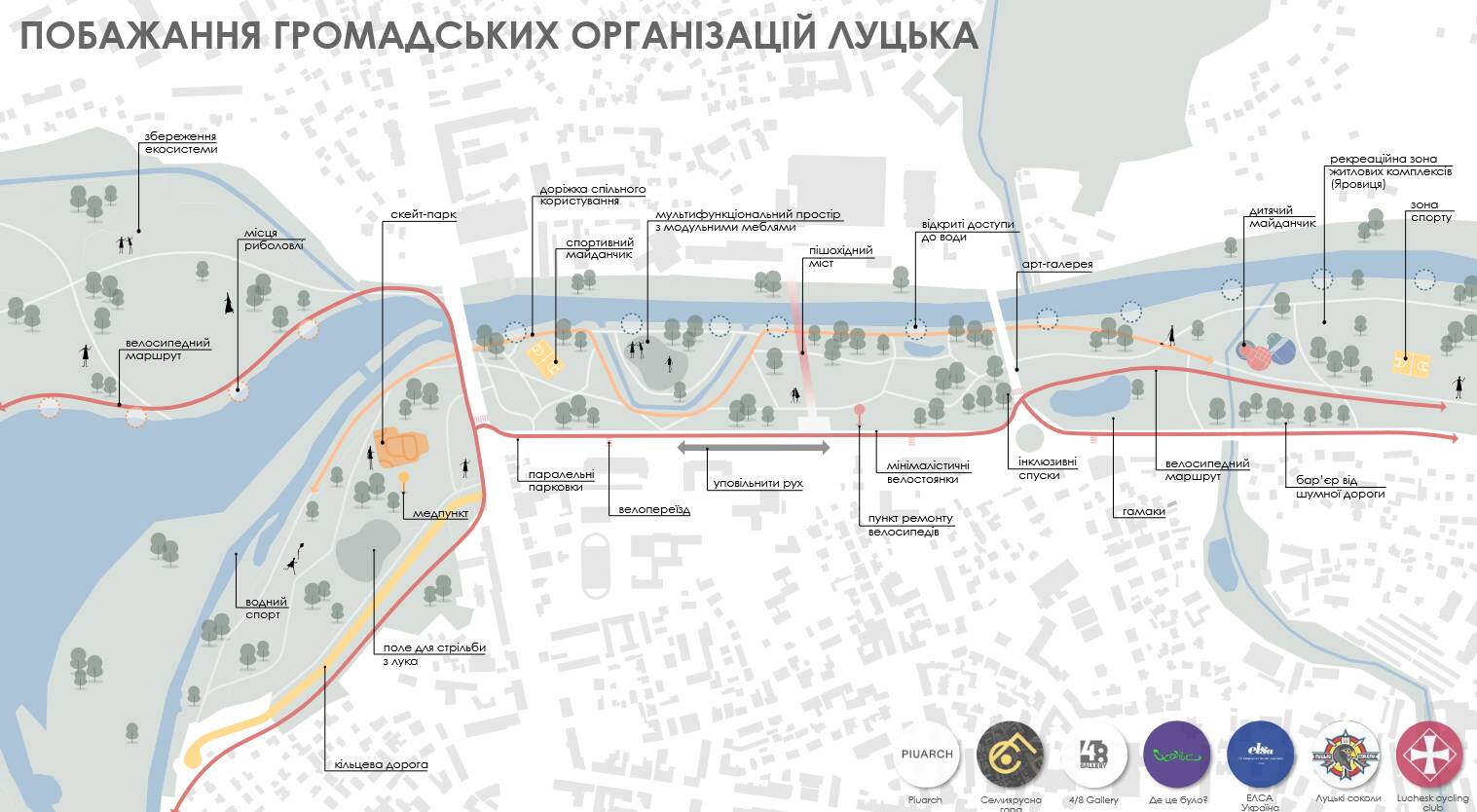 У Луцьку планують створити парк на Набережній за майже 50 мільйонів гривень. Проєкт парку ще не затверджено, але молоді архітектори та студенти, дізнавшись про грант від ЄС, вирішили показати, як він може виглядати.