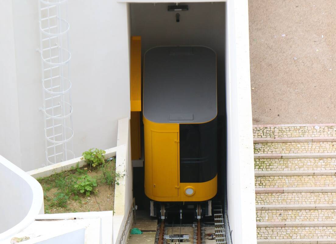 Нижня станція фунікулера спроєктована так, щоб гармонійно вписуватися в міське середовище, з’єднуючи його з вулицею через просторий двір. Кабіна складається з двох частин: непрозорої, де розташовані двері та аварійний вихід, і прозорої, з якої відкривається вид на монастир та прилеглий громадський сад.