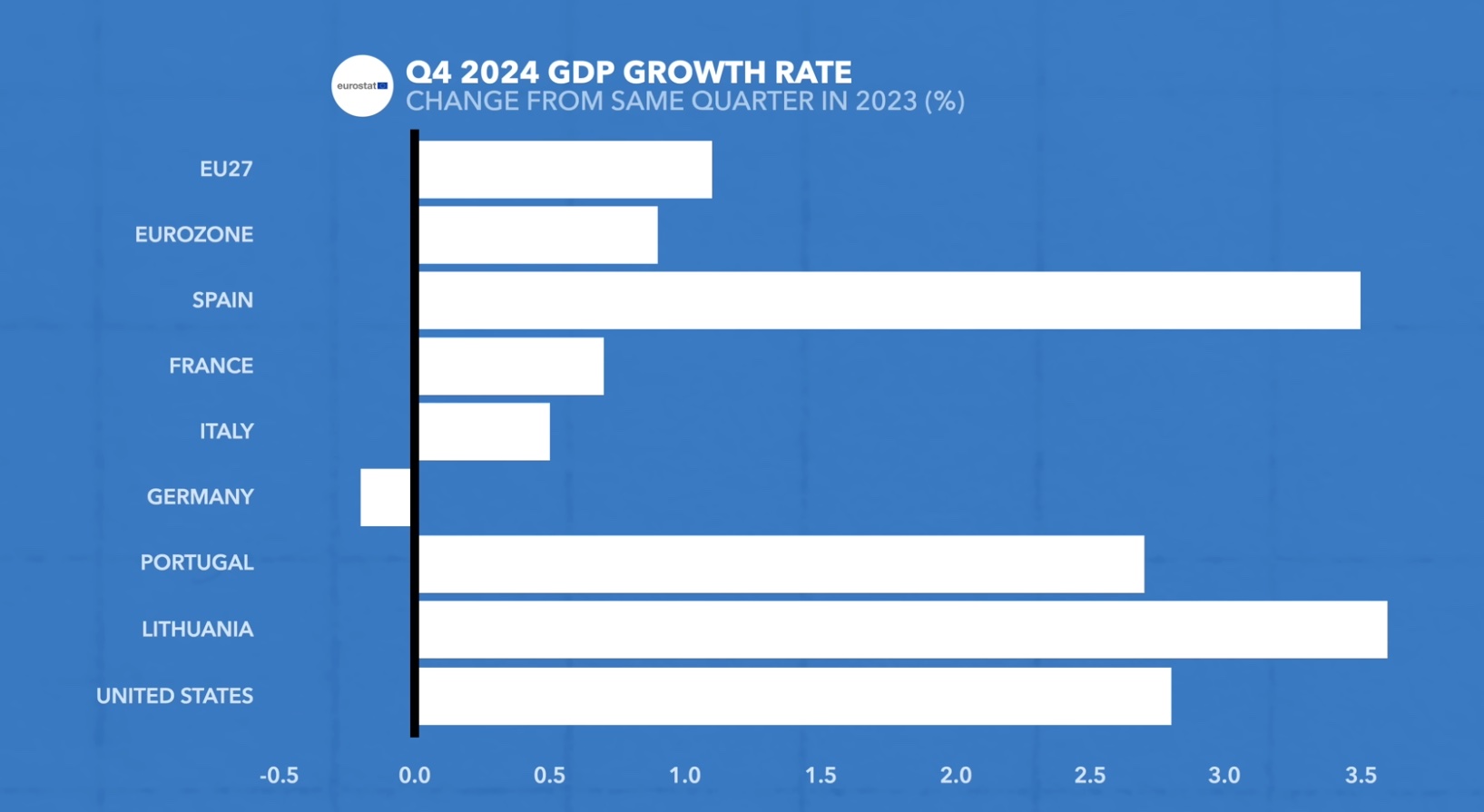 За рік ВВП країни зросло на 3,2%, що практично вп’ятеро більше за середній показник по єврозоні, й більше, ніж економіка США. У грудні Economist поставив Іспанію на 37-е місце найбагатших країн за п’ятьма критеріями: ВВП, ефективність фондового ринку, базова інфляція, безробіття та державний дефіцит. Прогнози на 2025 рік також виглядають добре.