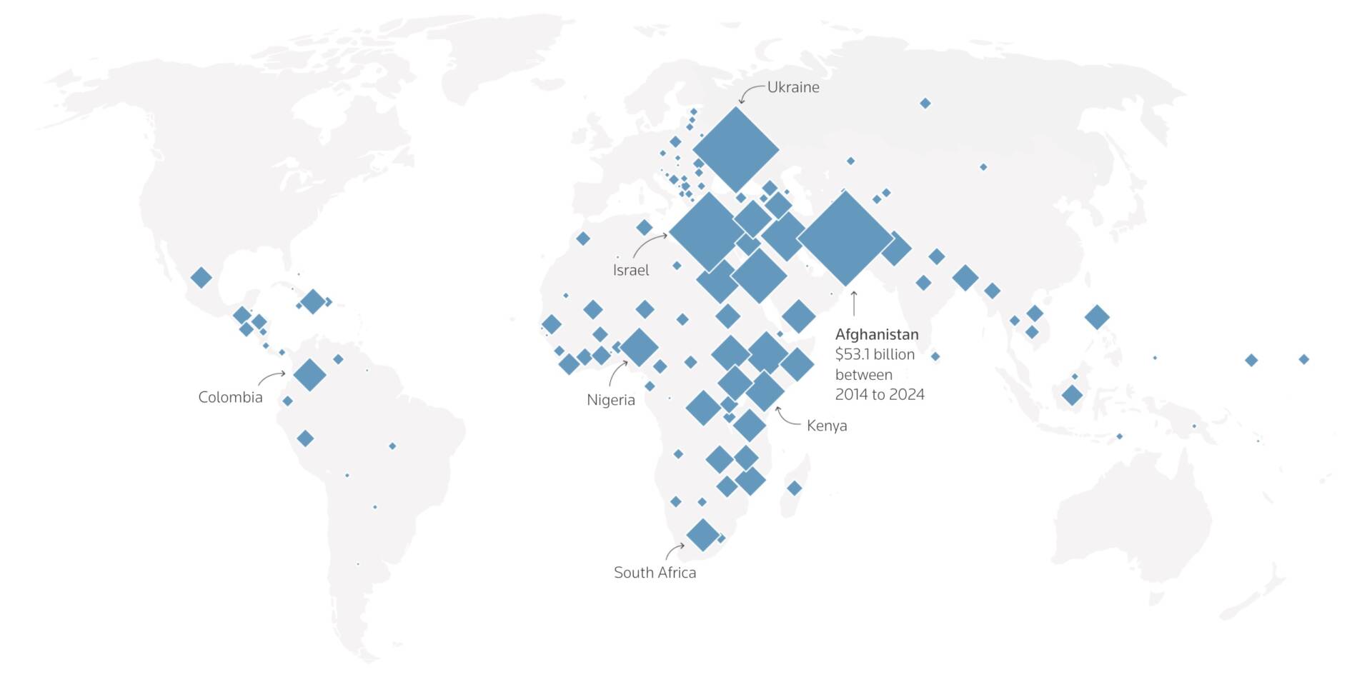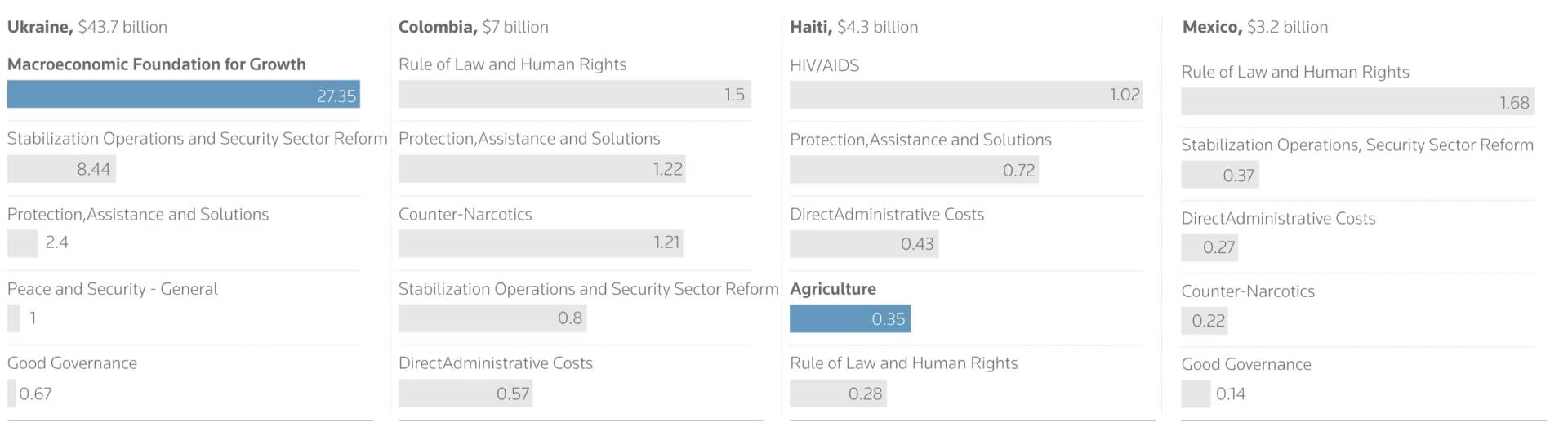 На Близькому Сході найбільше надавали грошей на сектор безпеки. Найбільшими отримувачами були Ізраїль, Йорданія, Ірак і Єгипет. Так само — в Азії, де найбільше грошей отримував Афганістан. В Африці більші обсяги спрямовувалися на боротьбу зі СНІДом: передусім в Ефіопії, Кенії, Південному Судані та Нігерії.