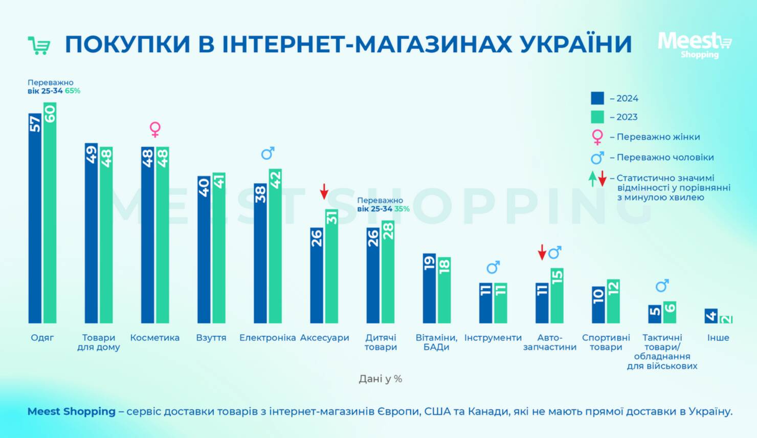 Одяг є найпопулярнішою категорією для 57% опитаних, разом з тим автозапчастини, спортивні та товари для військових в інтернеті шукає менше 11% респондентів.