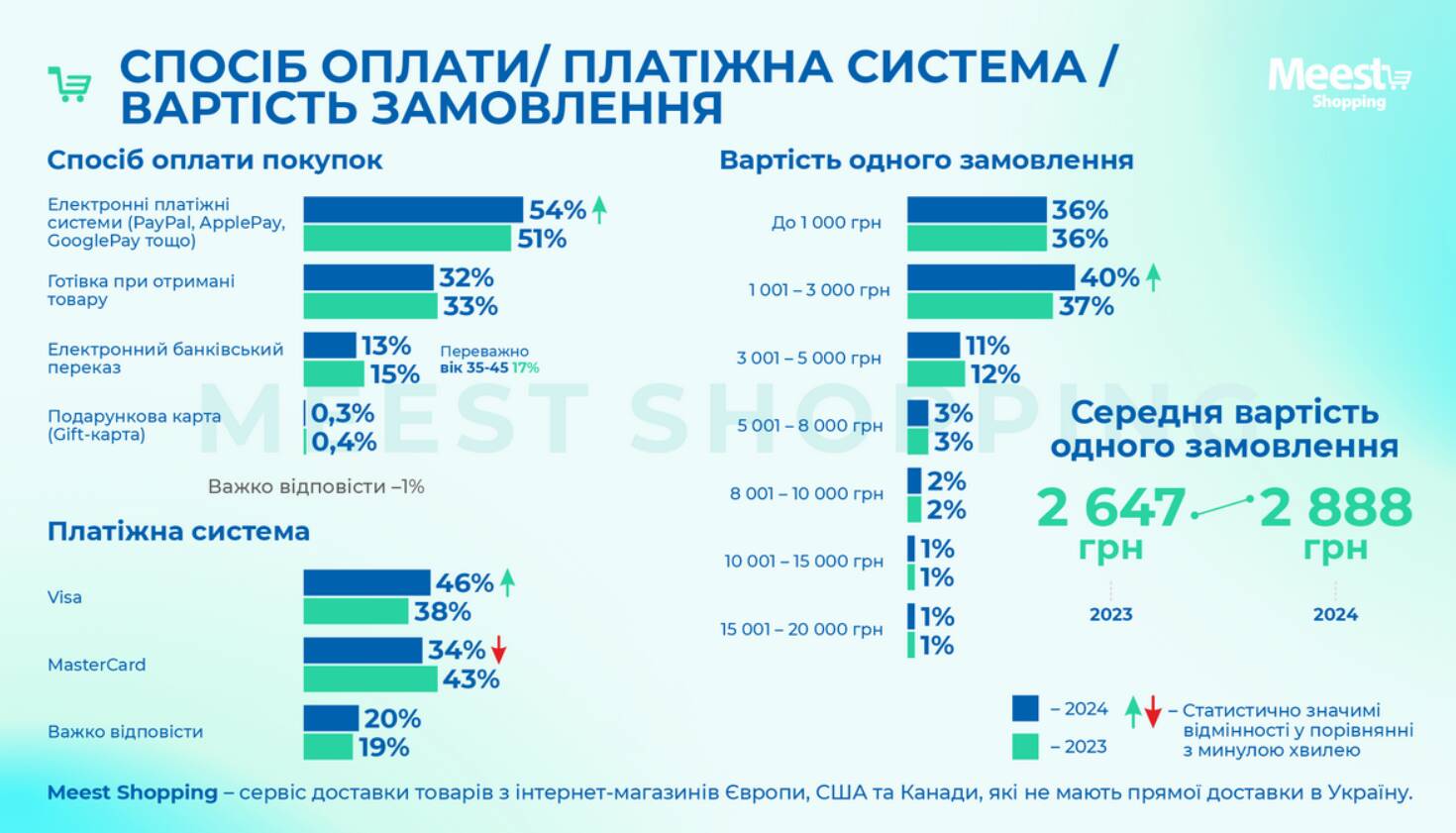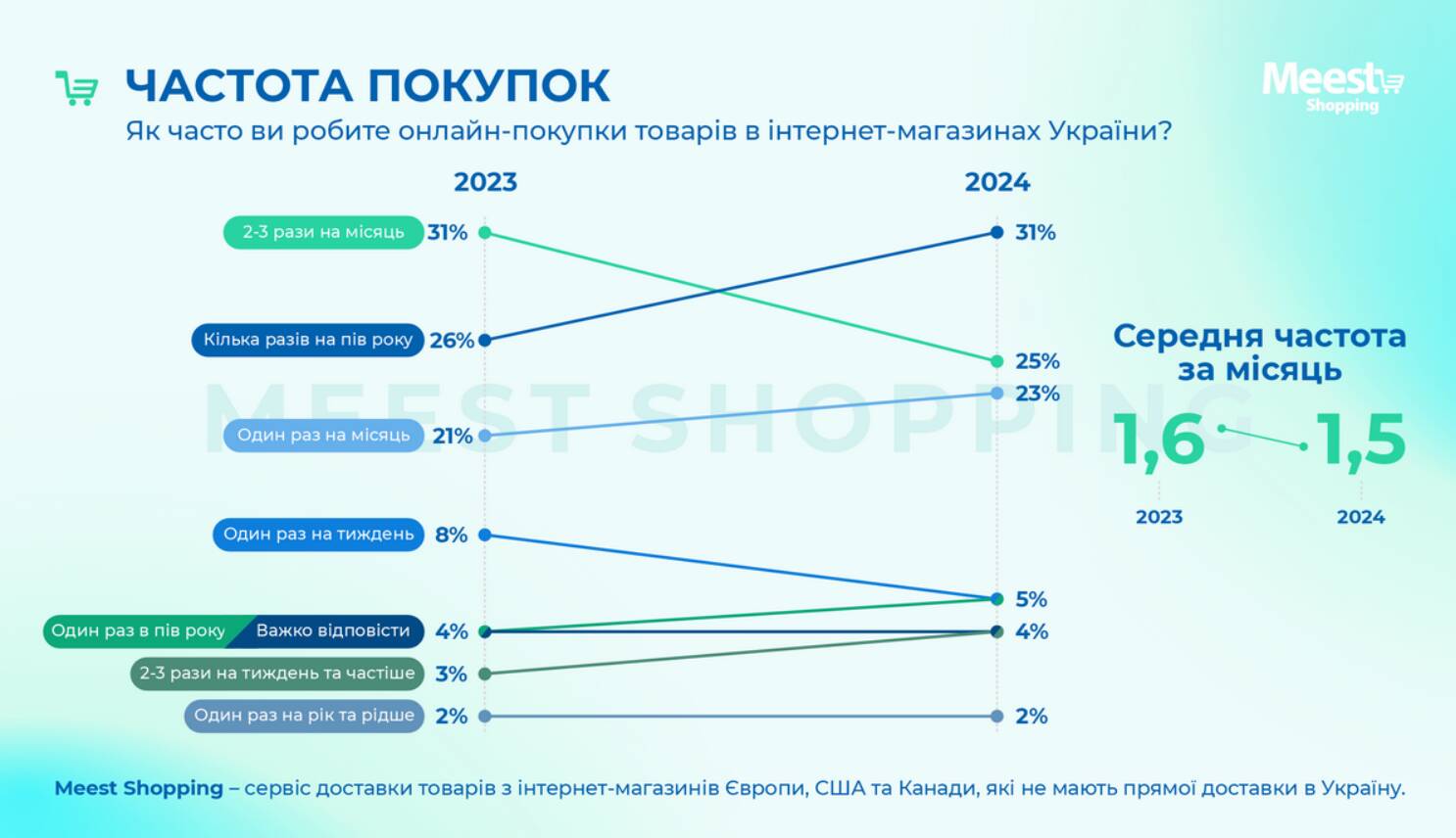 У 2024 році зросла частка покупок у діапазоні від тисячі до трьох тисяч гривень, та 36% опитаних не витрачають на замовлення більше тисячі гривен. І лише 1% опитаних здійснював покупку більшу за 15 000 гривень.