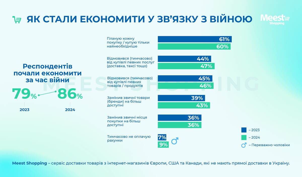Разом з тим понад 85% опитаних стали більше заощаджувати під час війни: планують покупки заздалегідь та навіть тимчасово відмовляються від певних товарів або послуг. І навіть 9% тимчасово не оплачують рахунки за для економії.