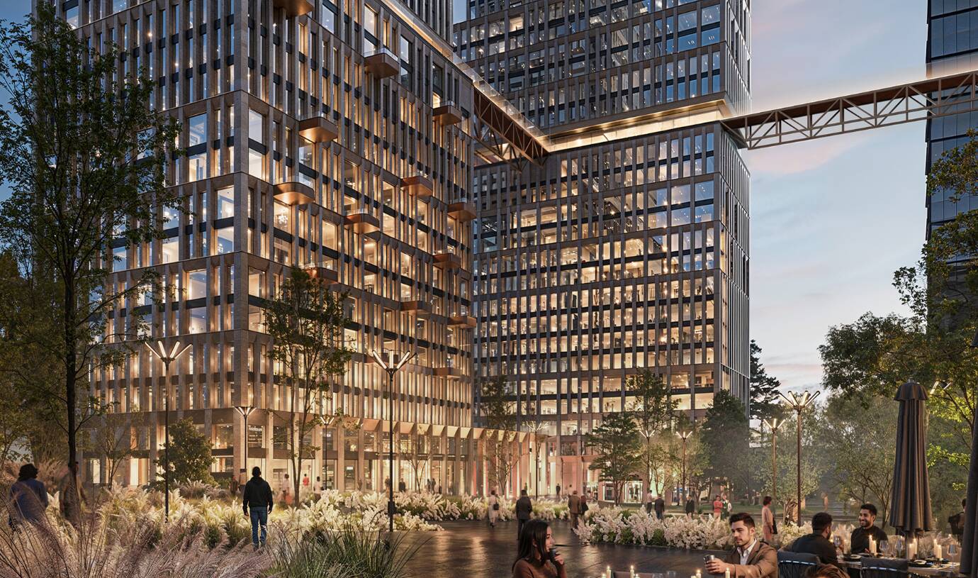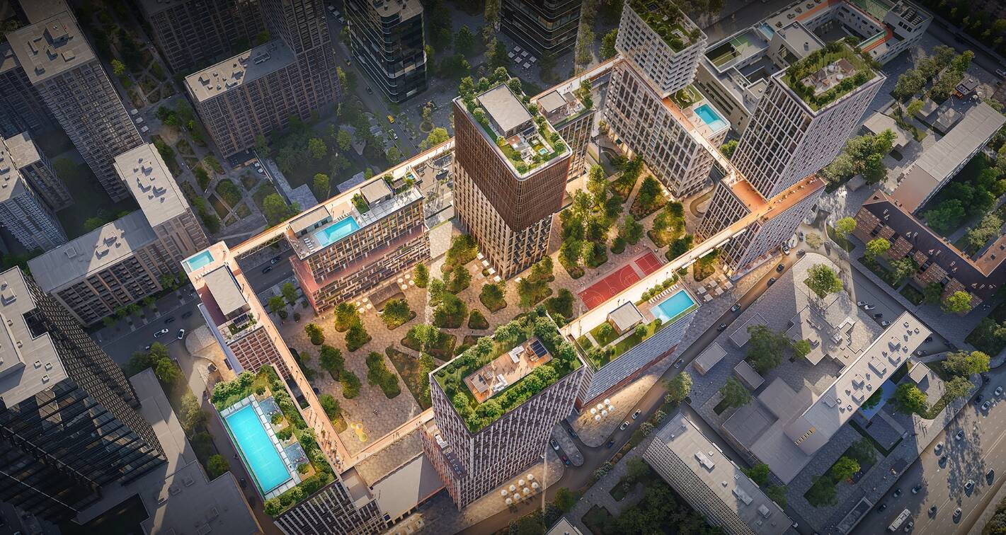 Вказано, що комплекс складатиметься з дев’яти будинків від 14 до 29 поверхів. На рендері зображено басейни на дахах будинків та міст, який сполучатиме їх між собою.