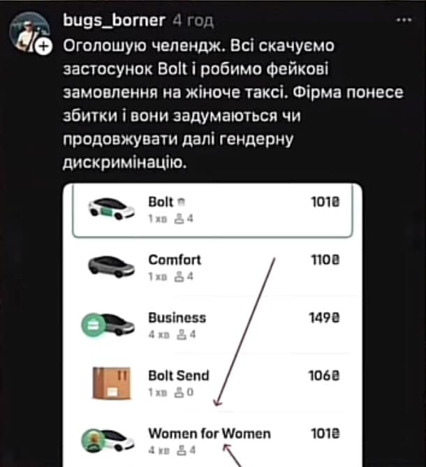 Наприкінці лютого інший сервіс таксі, Bolt, запустив поїздки Women for Women. Опція поки що доступна тільки в Києві.