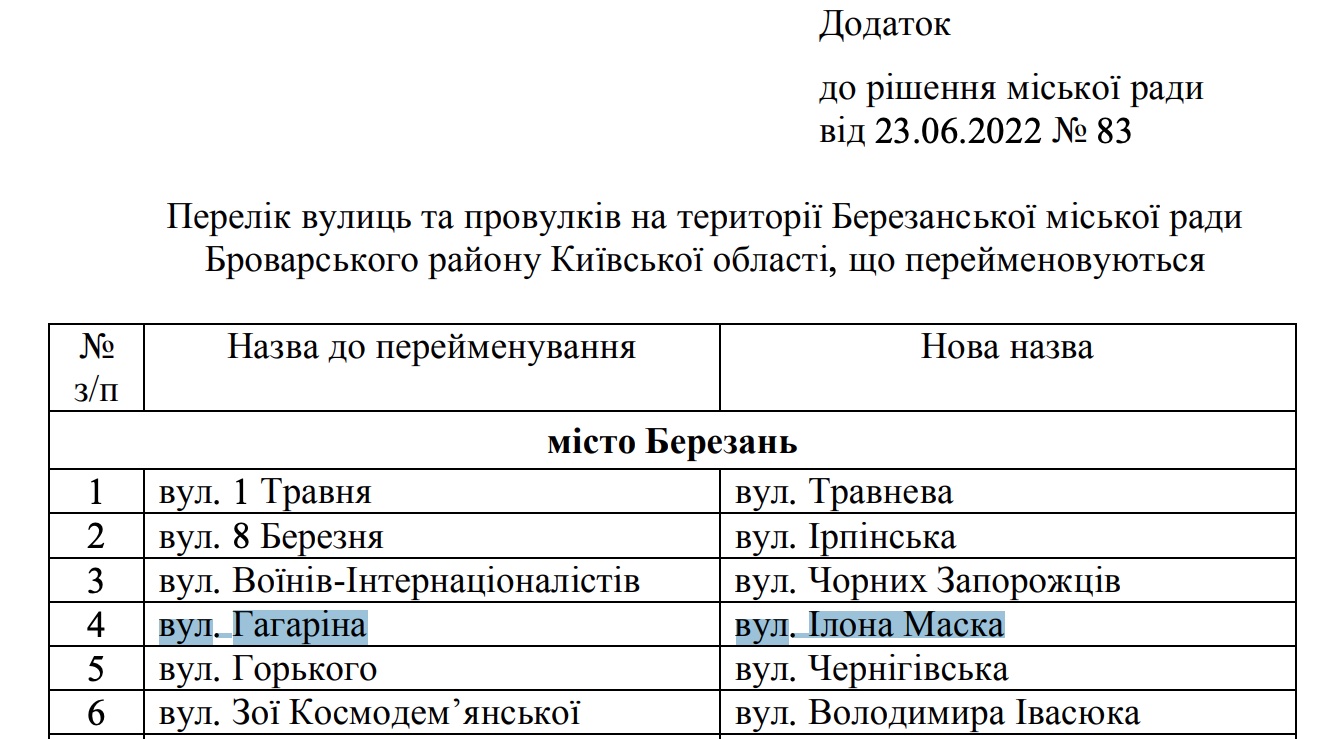 Зазначимо, що у місті Березань під Києвом є вулиця Ілона Маска. Її перейменували у 2022 році. Маск зараз є старшим радником Трампа і головою Департаменту ефективності уряду й останнім часом виступає проти допомоги Україні.