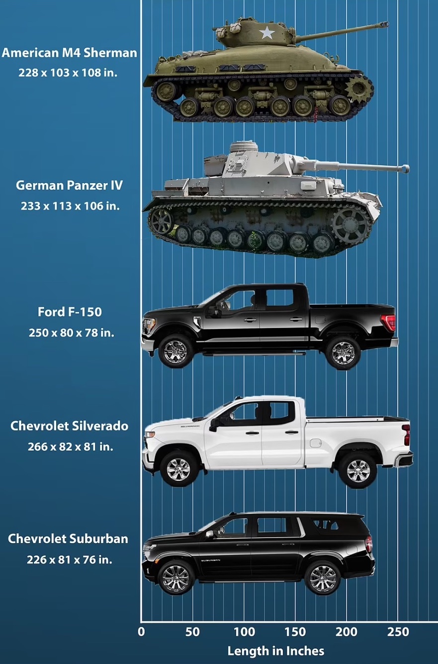 Найпопулярніші в США цивільні автівки за довжиною перевищують американський «Шерман», радянський Т-34, німецький «Панцер IV» і британський «Кромвель».