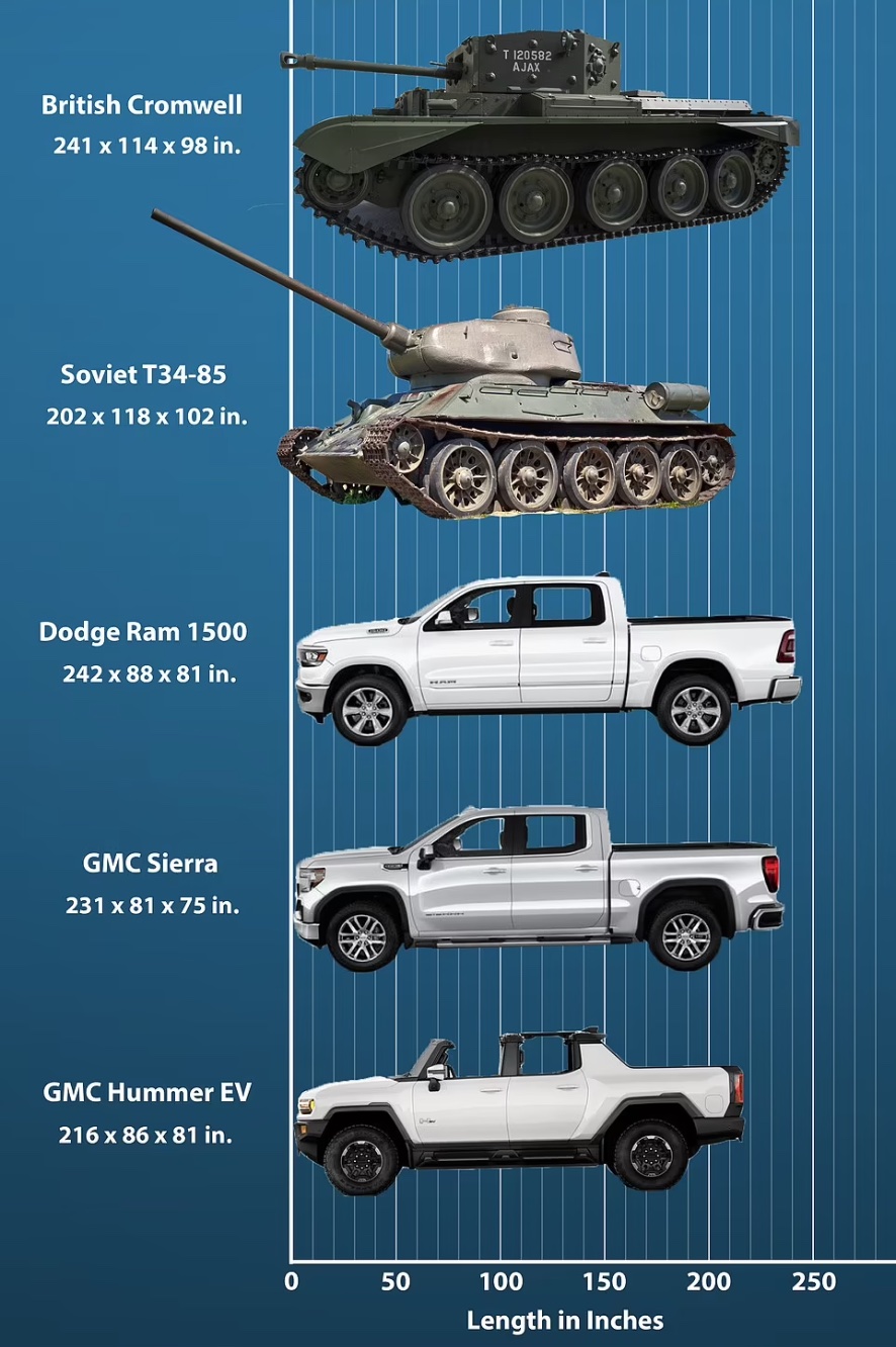 Якщо повірнювати з аналогічними середніми танками Другої світової, то вони теж переважно поступаються за довжиною сучасним американським SUV. Довжина радянського Т-34 становила 5,9 метра, нацистського «Панцера IV» — 5,9 метра, британського «Кромвеля» — 6,35 метра.
