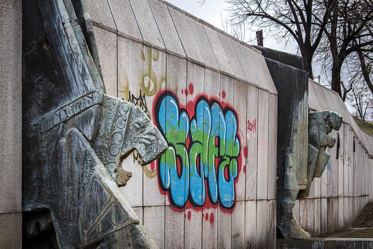 Задум проєкту також полягав у тому, що центр міста мав візуально римуватися з вражаючим меморіальним комплексом, що височіє на пагорбі за містом — Пам’ятником творцям Болгарської держави. Наприклад, оці леви на центральній площі повторюють стиль пам’ятника: