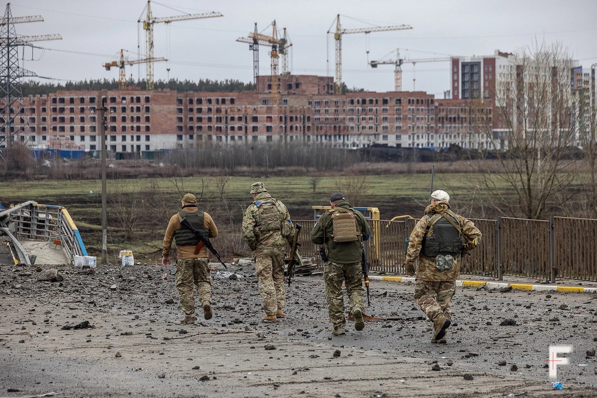 На першому фото українські військові йдуть через Романівський міст в сторону звільненого Ірпеня 2 квітня 2022 року. На наступному — меморіал 28 березня 2025 року.
