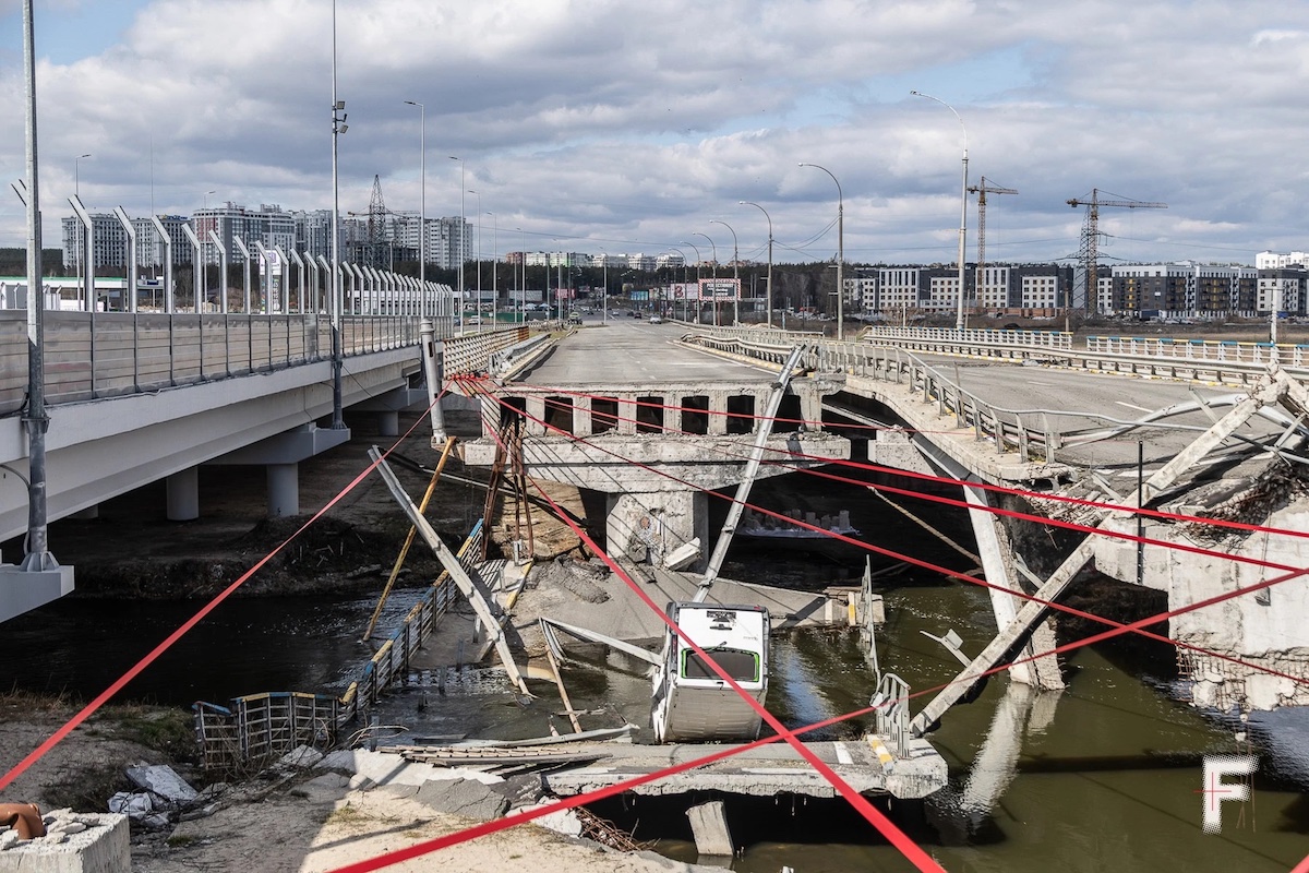 На першому фото — Романівський міст через річку Ірпінь першого квітня 2022 року. На другому — те, як він виглядає 28 березня 2025 року. Зруйновану частину перетворили на меморіал.