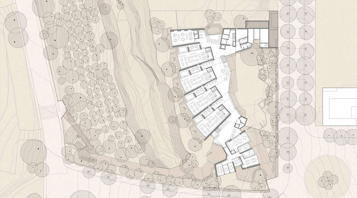 У плані будівля має довільну S-подібну форму, й ніби занурюється у пейзаж.