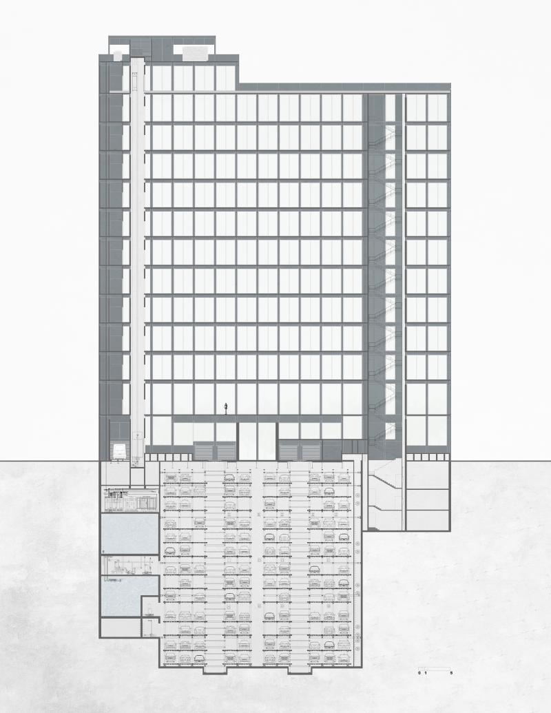 13-поверхову офісну будівлю вмістили у вузькій ділянці між односторонньою вулицею та залізничною колією. Ширина будівлі була також обмежена трубами, що йдуть на глибині метр-півтора під землею вздовж колії.