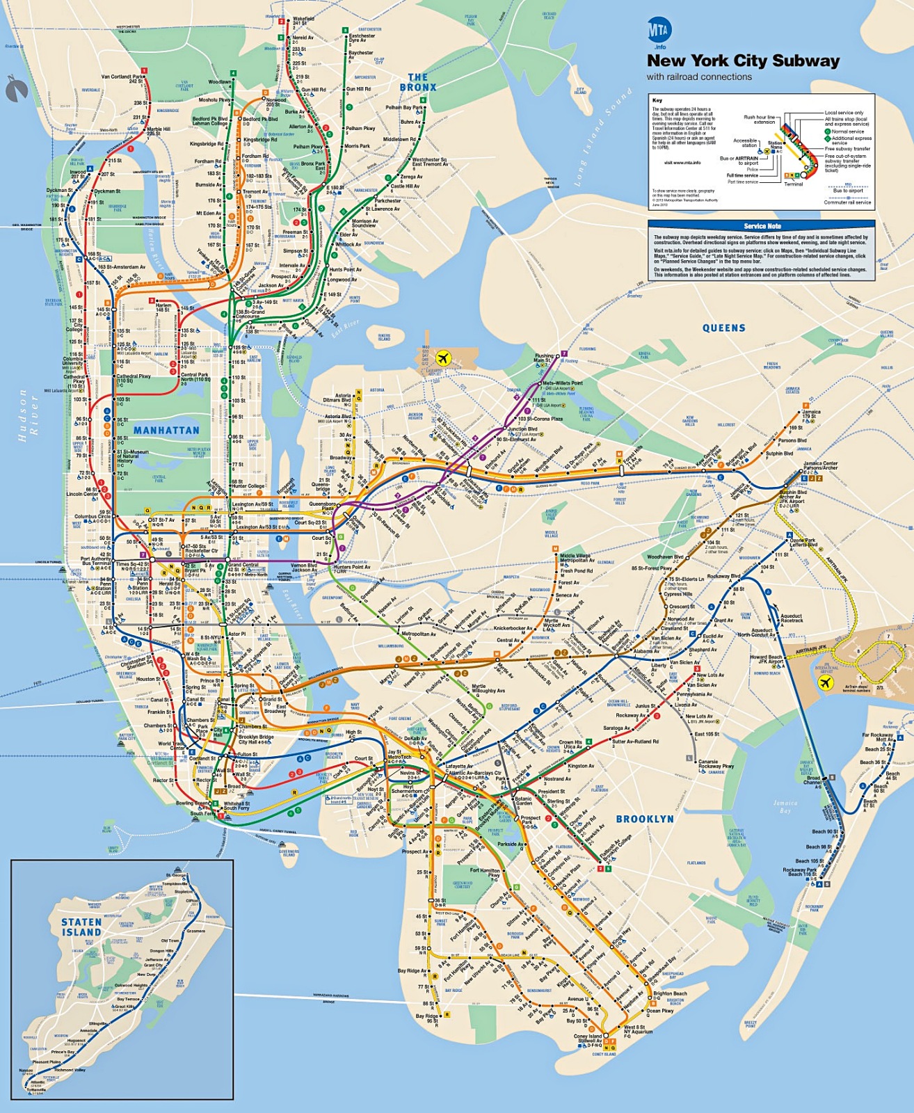 Станції пересадок позначені чіткіше, а міжміські та приміські залізничні маршрути додано, разом з транспортом до аеропорту, таким як AirTrain JFK.