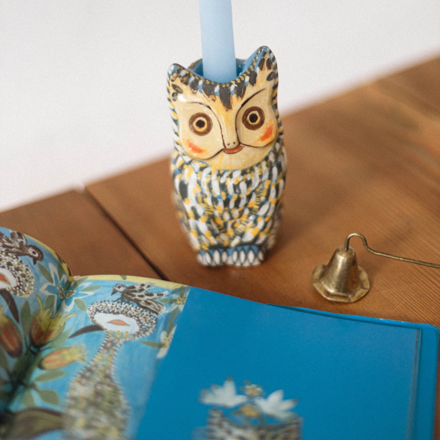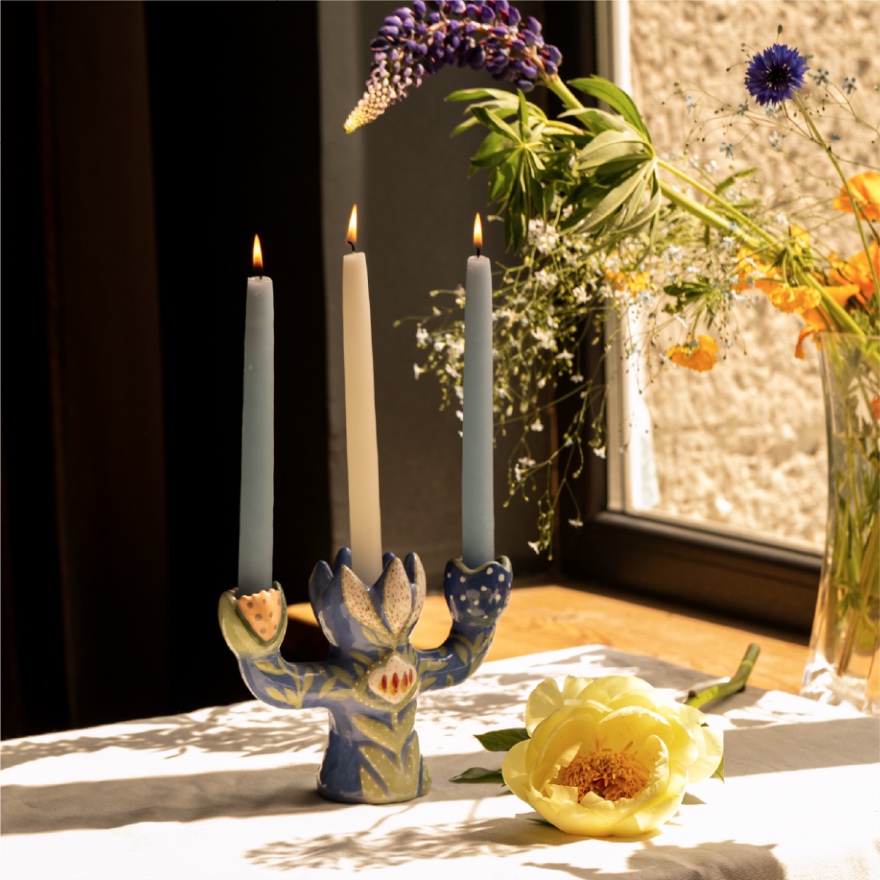 Свічники набиваються вручну через форму і пізніше майстри пропрацьовують деталі. Рушник зроблено з льону та прикрашено машинною вишивкою, скатертину — з бавовни з принтом.