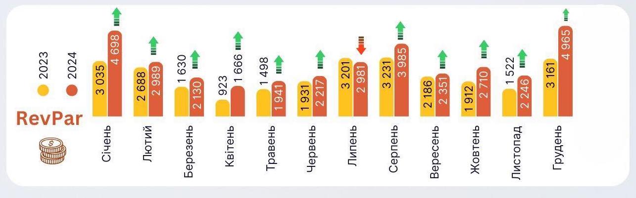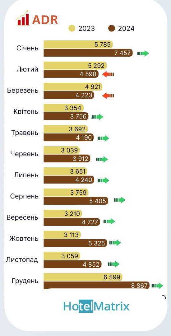Найвищі ціни — у січні та грудні. Середня ціна за готельний номер зросла з 5 785 гривень за ніч у січні 2023-го до 7 457 гривень у січні 2024-го. У грудні середня ціна збільшилася з 6 599 до 8 867 гривень.