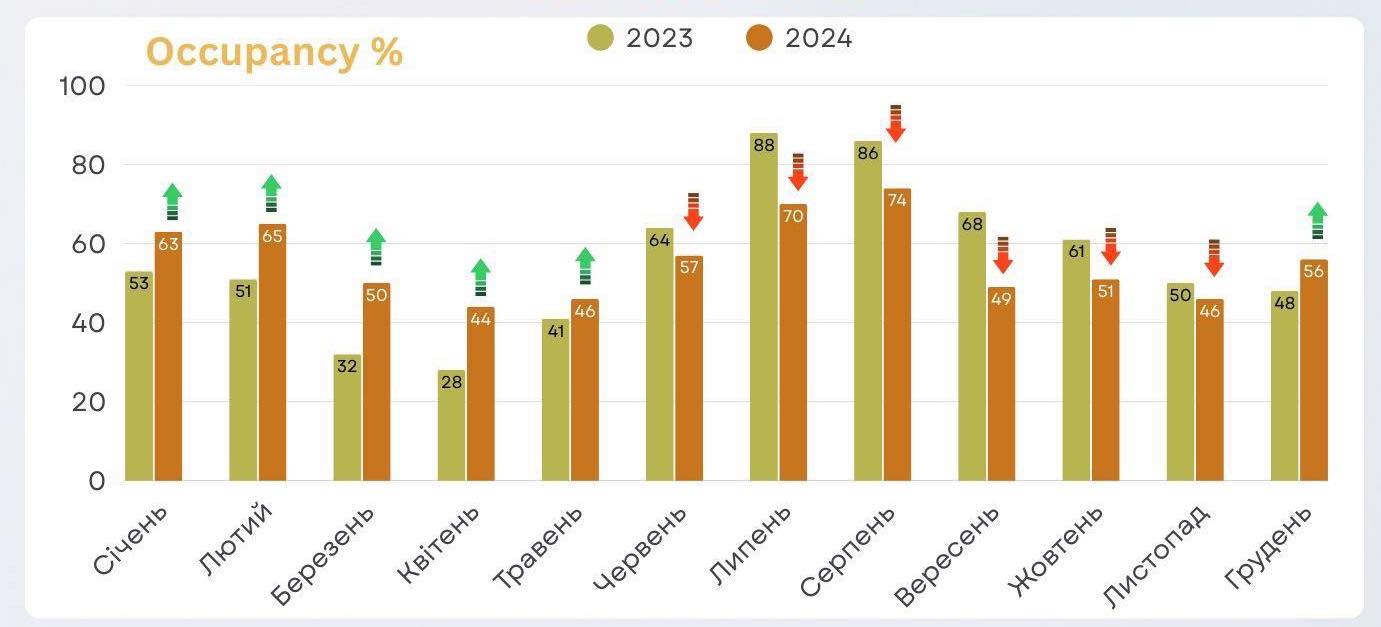 Завантаженість номерів за підсумками року становить 56% — в середньому вона майже не змінилася. Водночас графік демонструє відчутне падіння завантаженості влітку та восени та значне зростання у весняні місяці.