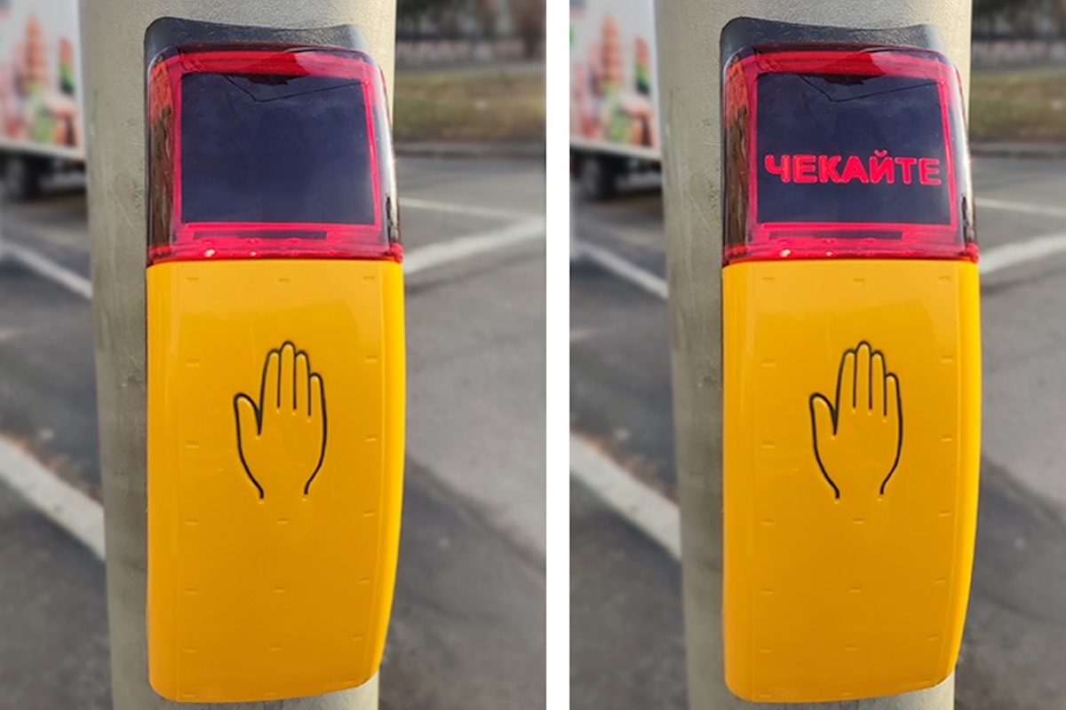 Це жовті прямокутні блоки, до яких достатньо піднести долоню, не торкаючись, і потримати кілька секунд, доки сенсор не спрацює. На табло має з’явитися напис «Чекайте». Зелене світло ввімкнеться за 5-30 секунд, залежно від програми світлофору.