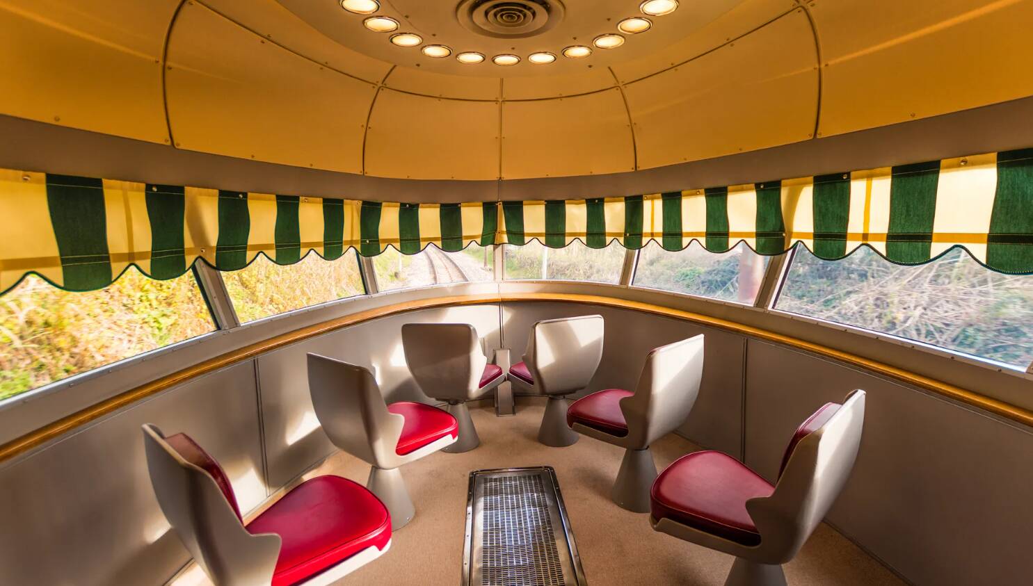 Інтер’єри поїзда дивували своєю елегантністю та авангардністю того часу. Сидіння з розкішного велюру різних кольорів, стіни під штучну шкіру і футуристичний бар, де персонал у формі подавав каву в елегантних керамічних чашках. М’які велюрові крісла, штори на вікнах, стіни під штучну шкіру — кожен з трьох вагонів мав свій основний колір: синій, бежевий або зелений