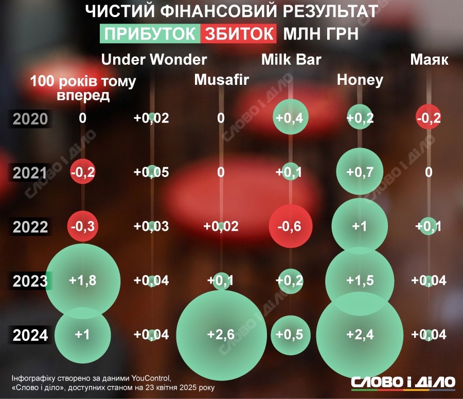 Ресторан-кондитерська Honey працює в Києві з 2014 року. Її прибуток стабільно зростав з кожним роком попри пандемію та війну: з 0,2 мільйона гривень у 2020 році до 2,4 мільйона у 2024-му.
