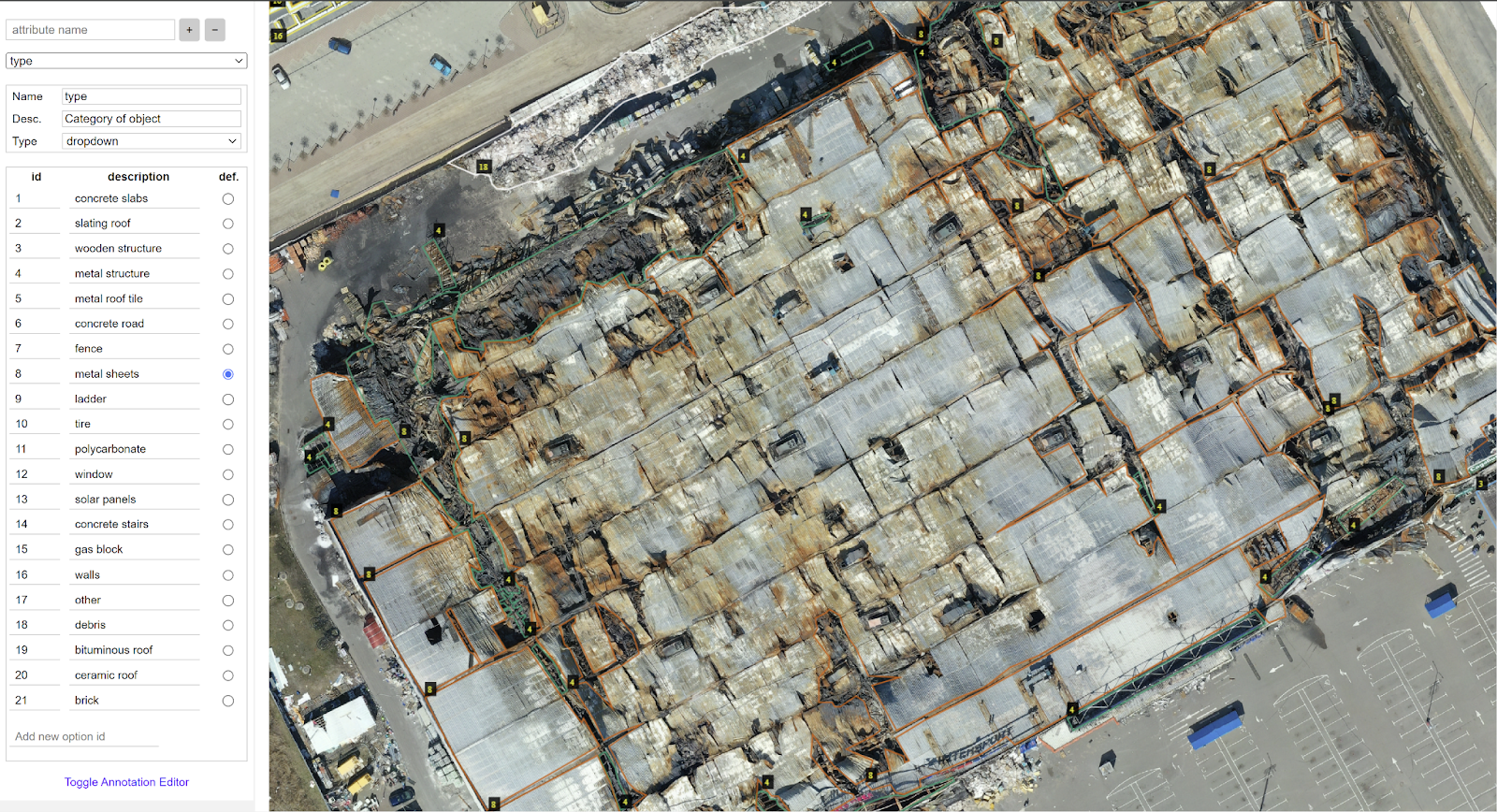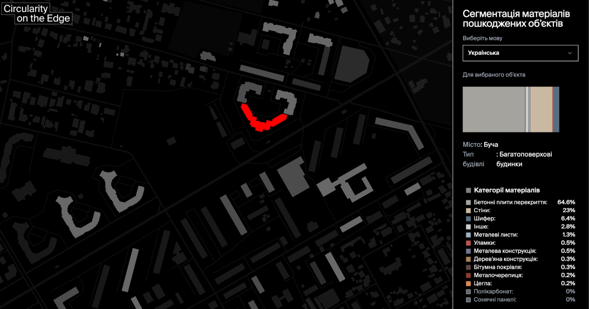 Для аналізу об’єктів у пілотному проєкті використовували знімки БПЛА всіх будівель Бучі, файли з оцінкою руйнувань, надані організацією Damaged in UA, та дані з відкритих джерел. ШІ, натренований дослідниками з ReThink, аналізує ці знімки, визначає та класифікує матеріали на зруйнованих об’єктах. Так система дає статистику, який відсоток різних матеріалів присутній на знімках пошкоджених будівель.