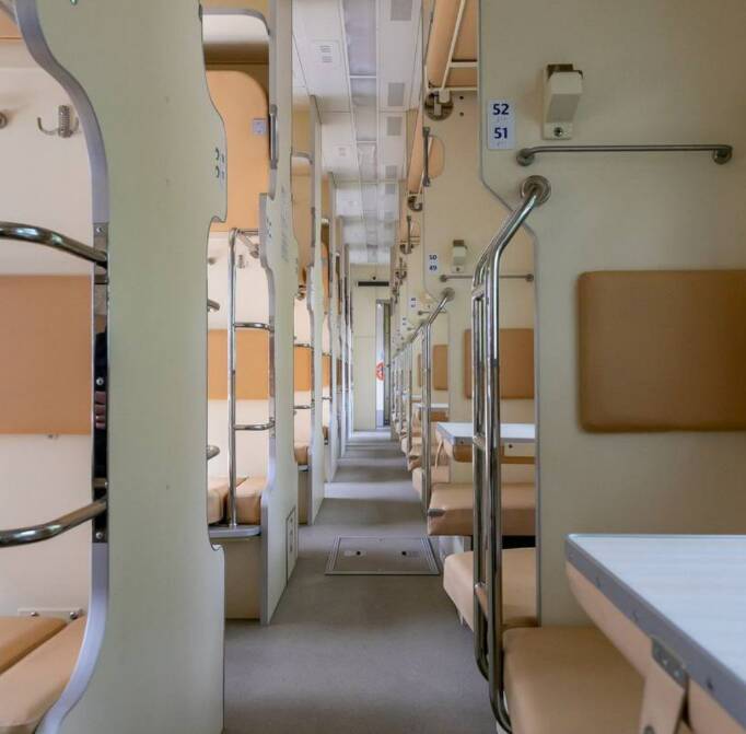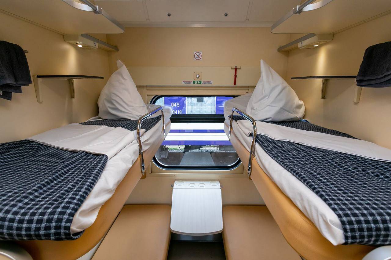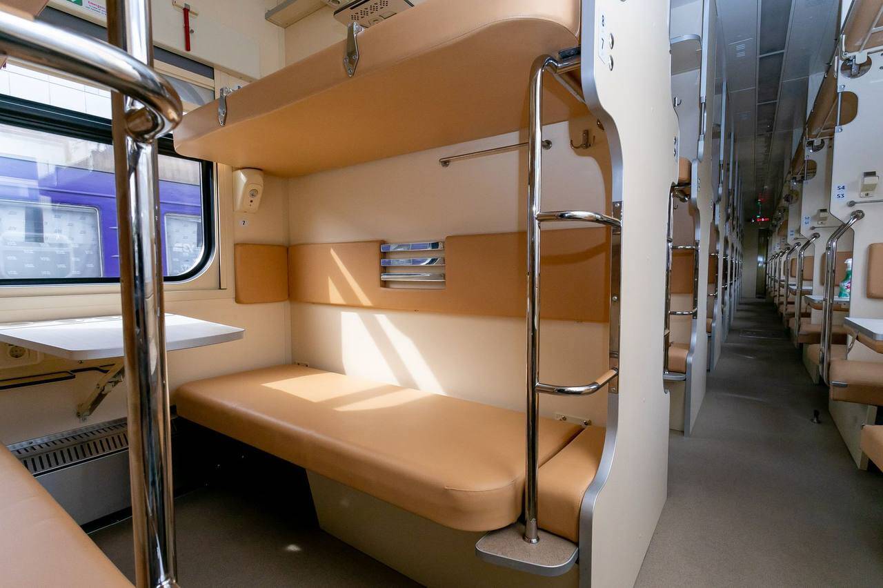 Нові вагони мають покращену конфігурацію для більшого комфорту пасажирів: м’які бокові спинки на поличках, зручні сходи для підйому на верхню полицю, міні-перегородки для приватності.