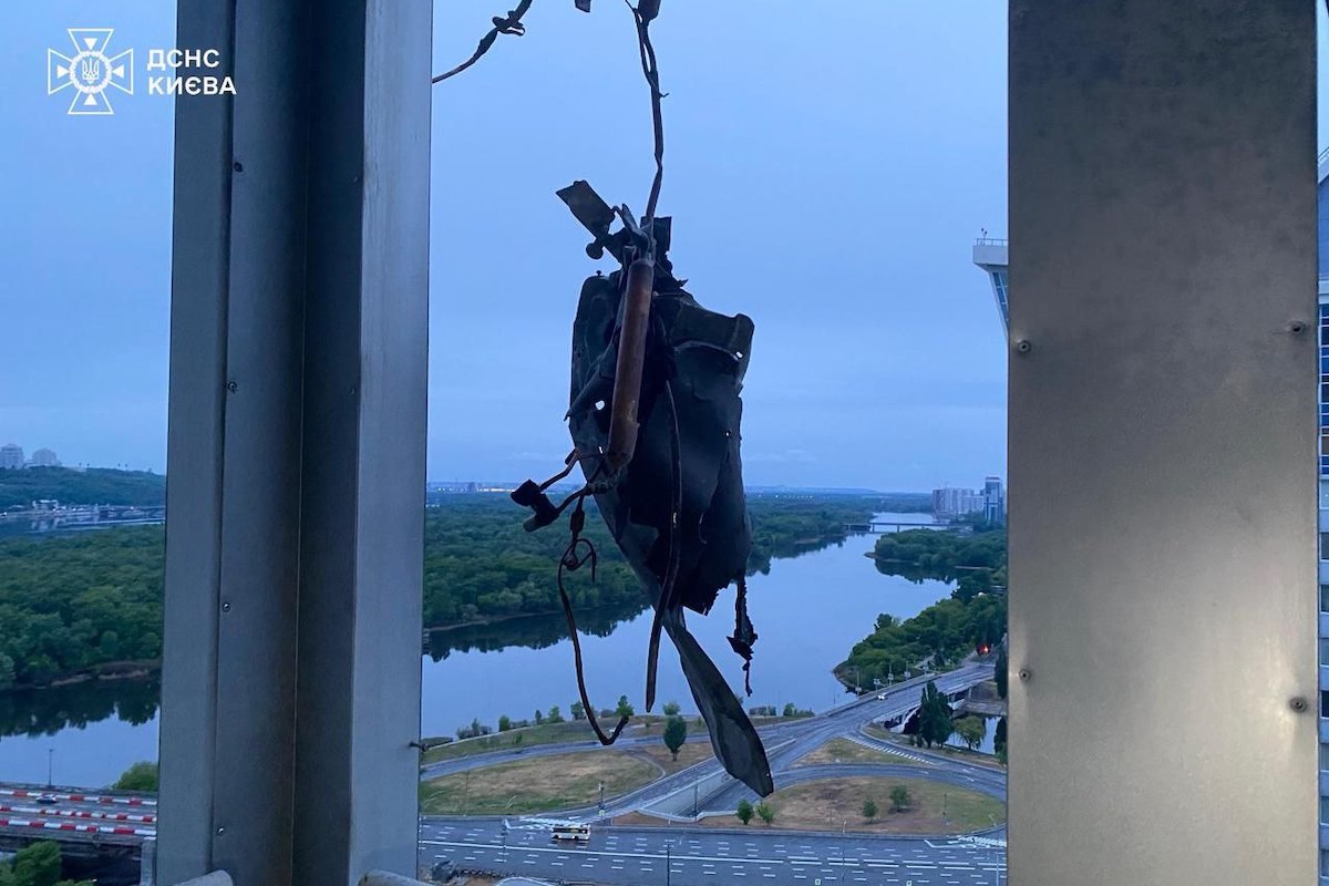 У Дніпровському районі дронами пошкоджено 30-поверховий житловий будинок, на верхніх поверхах, де розміщено загальний балкон. Постраждалих немає. Також пошкоджено ТРЦ.