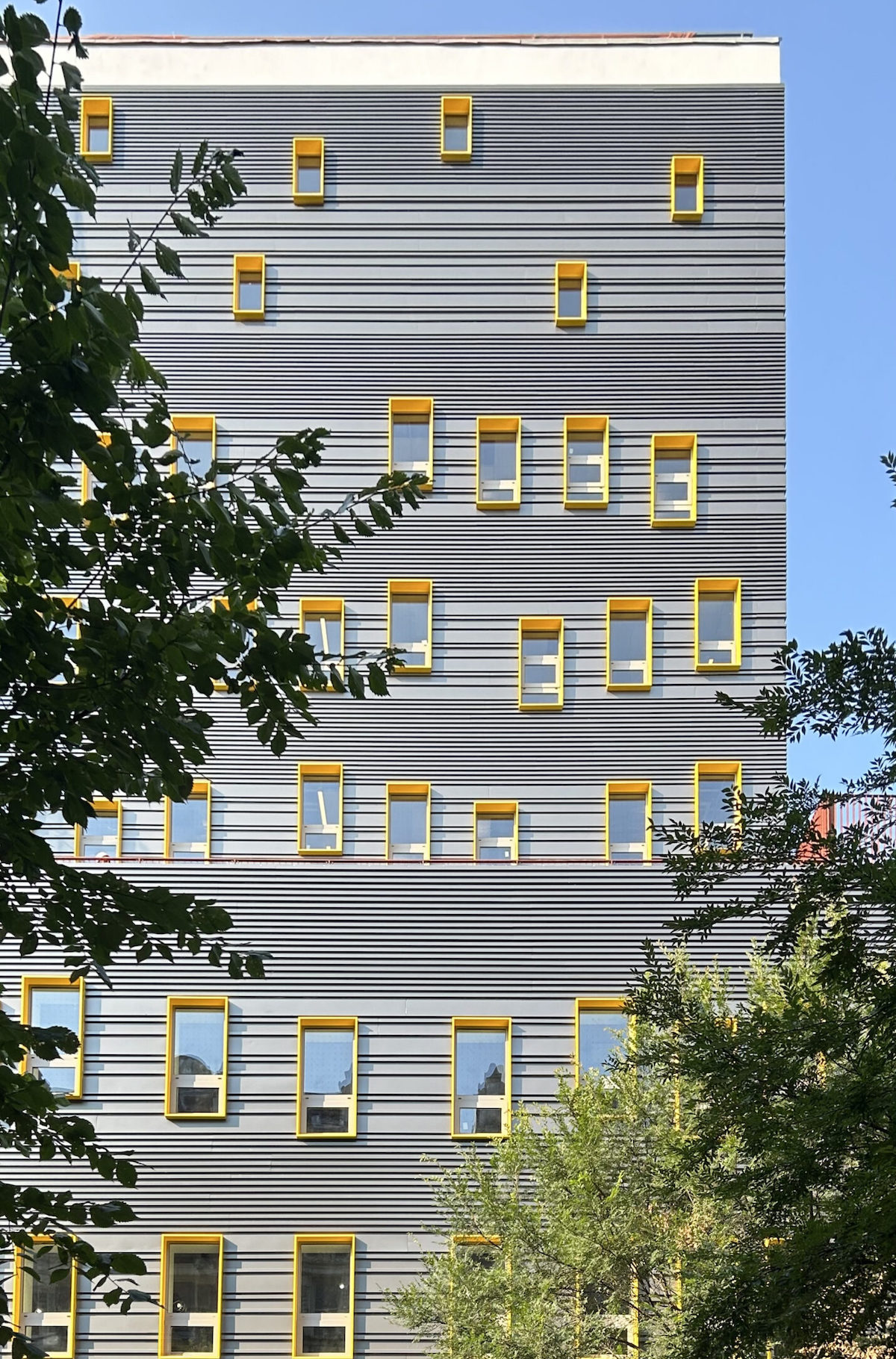 Проєкт перебудови столітнього гаража розробила компанія GLUCK+. Дизайн фасаду з горизонтальними лініями та розташованими на різній висоті жовтими вікнами відсилає до нотних аркушів.