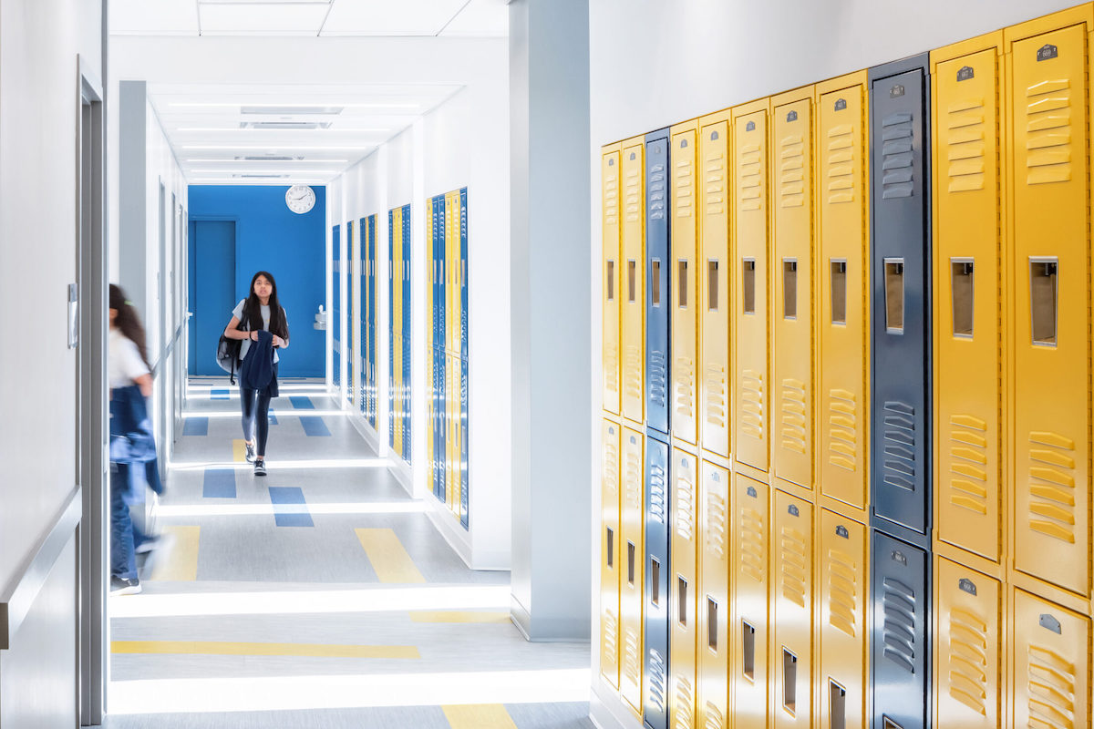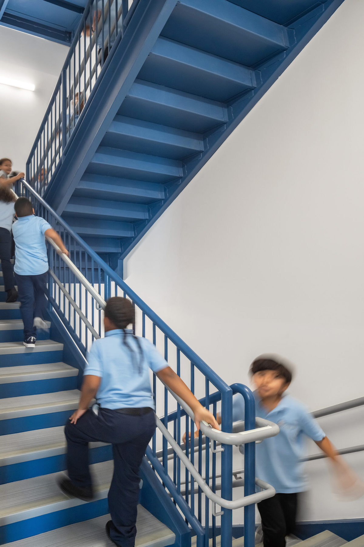 Планування нетипове, тож навігація тут особливо важлива. Жовті смуги на підлозі вказують напрямок до жовтих сходів, а сині — до синіх. Діти додали для них ігрову функцію: архітектори побачили, як учні стрибають по кольорових смугах.