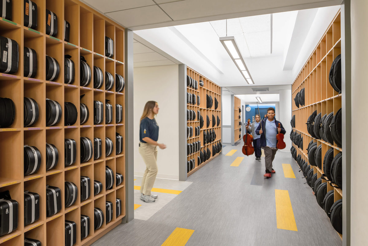 Виготовлені на замовлення дерев’яні шафи закривають стіни коридору від підлоги до стелі. Шафки різного розміру — для віолончелей, скрипок, альтів і кларнетів.